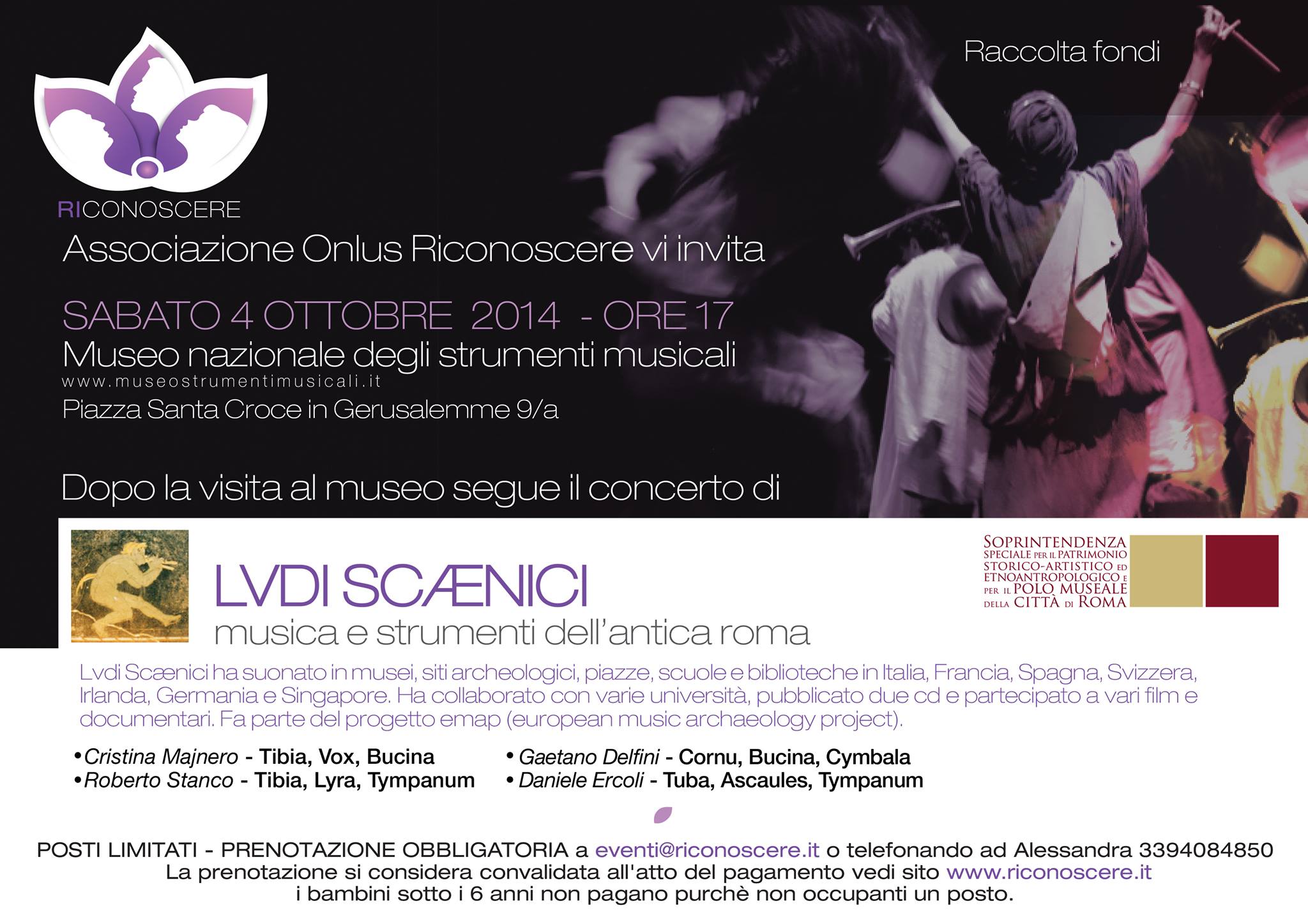 L’associazione Riconoscere Onlus invita all’evento di raccolta fondi Ludi Scaenici: un’occasione di visitare il Museo Nazionale degli Strumenti Musicali‚ a Roma‚ all’insegna della solidarietà. L’appuntamento è sabato 4 ottobre 2014 alle ore 17‚ in Piazza Santa Croce in Gerusalemme 9/A.