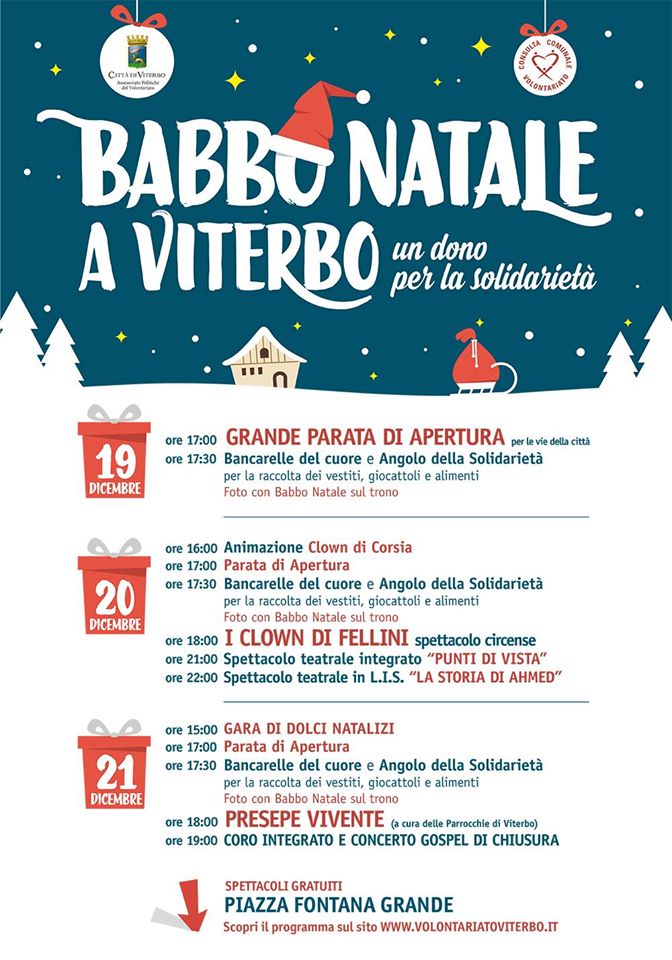 Venerdì 19 dicembre 2004 c’è Babbo Natale a Viterbo. Per la gioia di grandi e piccini‚ la parata con la banda e la slitta di Babbo Natale avrà avvio alle ore 17.00 in Piazza Fontana Grande.