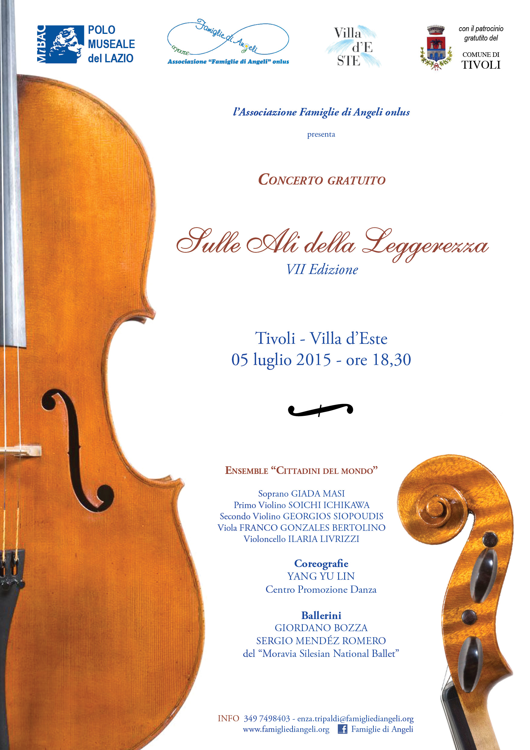 L’Associazione Famiglie di Angeli onlus promuove e organizza la 7° edizione del Concerto Sulle Ali della Leggerezza che si svolgerà il domenica 5 luglio 2015‚ ore 18‚30 nella splendida Villa d’Este a Tivoli (Roma).