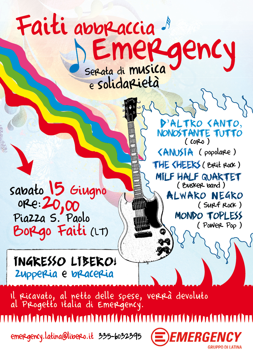 Al via la quarta edizione di Faiti abbraccia Emergency: la manifestazione‚ organizzata dal gruppo territoriale di Emergency di Latina‚ che si terrà sabato 15 giugno 2013 a Borgo Faiti‚ Piazza San Paolo Apostolo‚ a partire dalle ore 20.00. Sarà una serata all’insegna della solidarietà‚ dell’arte e della buona musica.