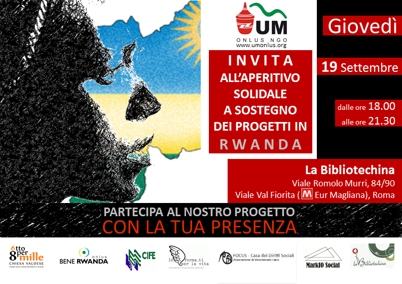 L’Associazione UM ONLUS NGO da anni impegnata in progetti a sostegno della popolazione del Rwanda‚ organizza per giovedì 19 settembre 2013‚ alle ore 18.30 un aperitivo solidale.