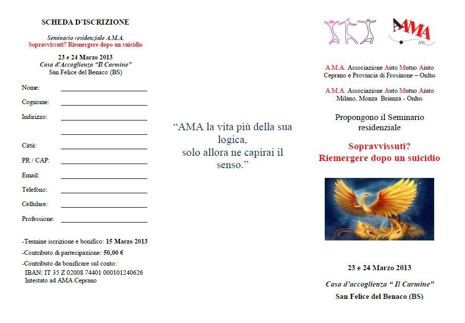 Sopravvissuti? Riemergere dopo un suicidio. Convegno promosso da AMA Ceprano a Brescia il 23 e il 24 marzo 2013.
