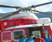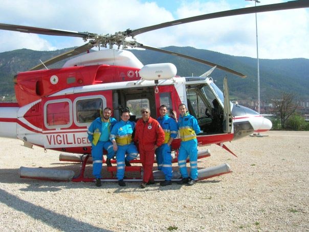 Alcuni volontari davanti all'elicottero usato a Coppito, in provincia di L'Aquila, in aiuto dei terremotati