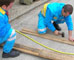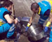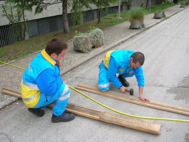 Due volontari impegnati dopo il terremoto a Coppito, in provincia di L'Aquila