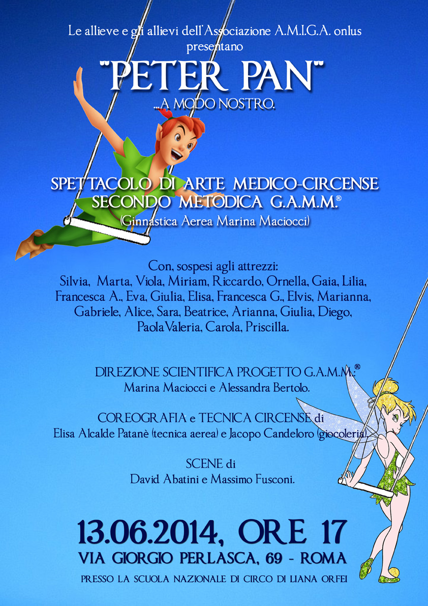 Venerdì 13 giugno alle ore 17.00 l’associazione AMIGA presenta lo spettacolo di arte medico circense secondo metodica G.A.M.M. (Ginnastica Aerea Marina Maciocci) Peter Pan... a modo nostro.