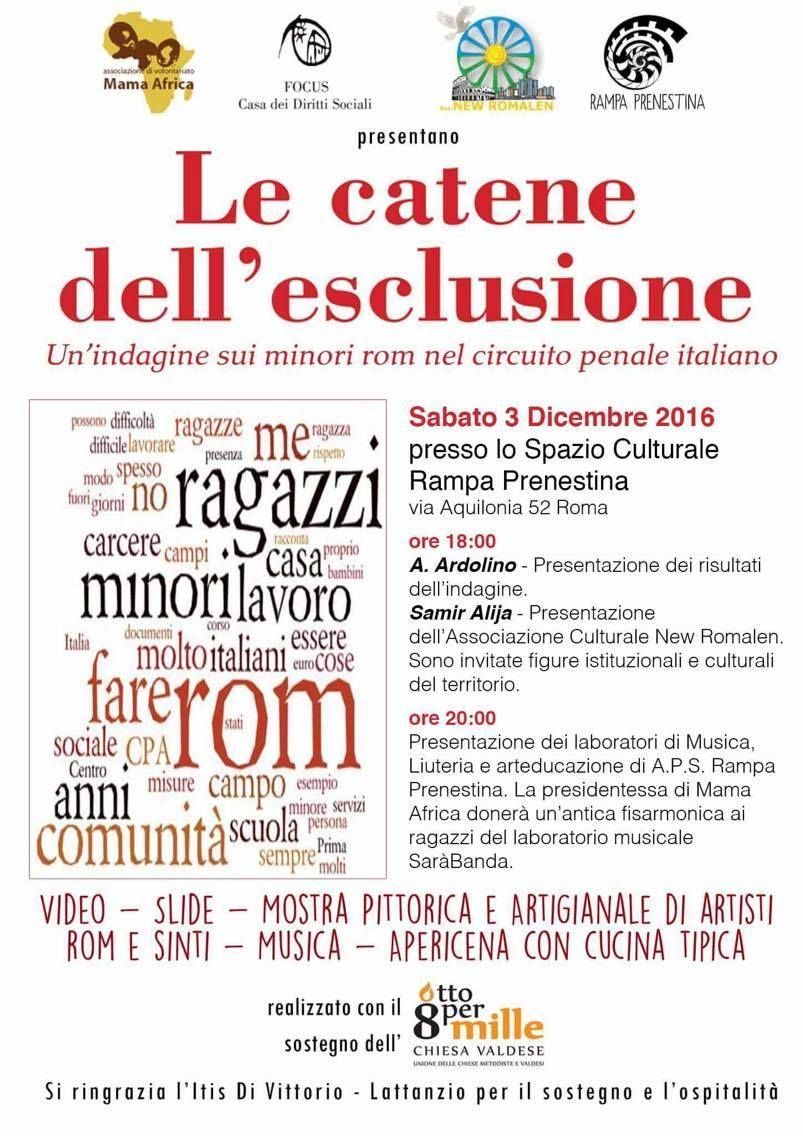 Il rapporto “Le Catene dell'esclusione‚ un'indagine sui minori Rom nel circuito penale italiano” verrà presentato il 3 dicembre alle 18‚00 presso l'I.T. Di Vittorio‚ via Teano 223‚ Roma. Il rapporto è il risultato del progetto di ricerca L´ambito penale e l´esclusione a catena: Rom‚ Sinti e Caminanti condotto da Mama Africa con il sostegno dell´Otto per Mille della Tavola Valdese e di Focus - Casa dei Diritti Sociali.