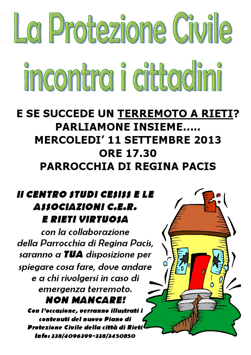 Partirà mercoledì 11 settembre 2013 presso la Sala Parrocchiale di Regina Pacis (ingresso da via Paolessi) a partire dalle ore 17.30 la campagna di sensibilizzazione della popolazione intitolata Terremoto‚ parliamone insieme: la Protezione Civile incontra i cittadini‚ promossa da Centro Studi CESISS e le Associazioni CER Protezione Civile e Rieti Virtuosa‚ in collaborazione con i Comitati di quartiere e le varie Parrocchie di Rieti.