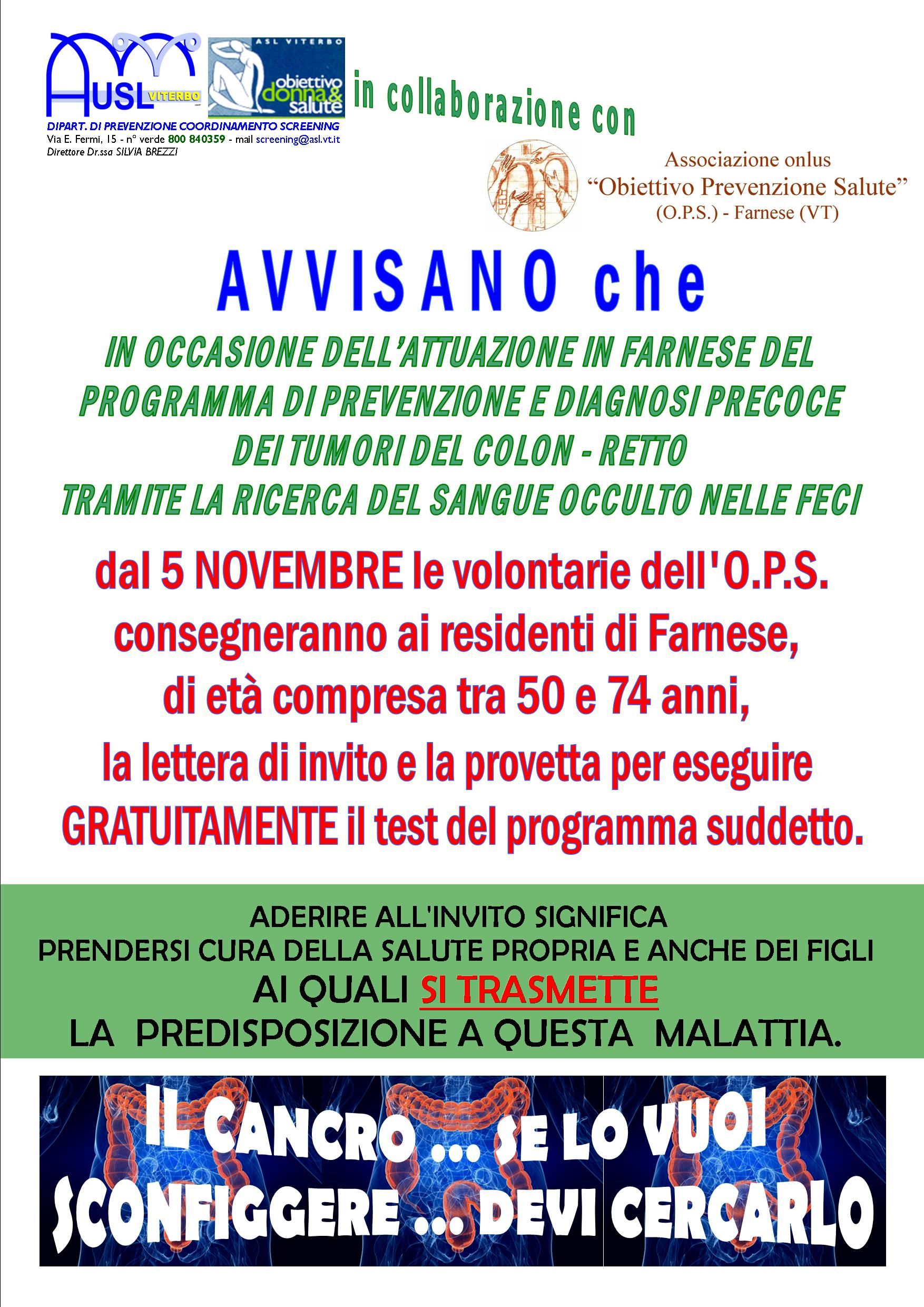 In occasione dell’attuazione a Farnese (Vt) del programma di prevenzione e diagnosi precoce dei tumori del colon retto l’associazione OPS Obiettivo Prevenzione Salute‚ in collaborazione con la ASL di Viterbo dà il via alla propria iniziativa intitolata Il cancro se lo vuoi sconfiggere devi cercarlo.