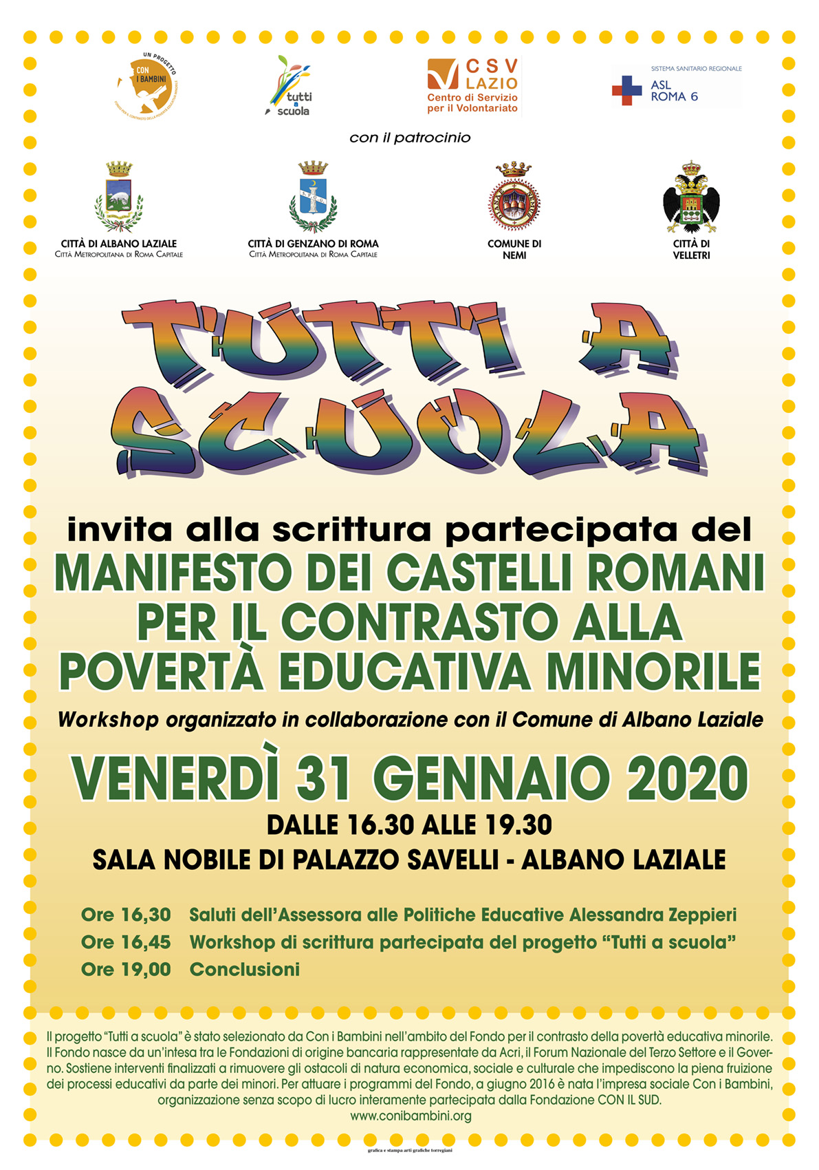 Anche sul territorio dei Castelli romani la povertà educativa è un problema sempre più avvertito‚ produce povertà economica e marginalità‚ impedisce lo sviluppo del territorio e nega un futuro ai giovani. La povertà educativa si sconfigge solo con l’impegno della comunità intera: non solo le famiglie e la scuola‚ ma anche l’associazionismo‚ le istituzioni‚ il territorio. Per questo all’interno del progetto Tutti a scuola si sta lavorando per arrivare a definire il Manifesto dei Castelli romani per il contrasto alla povertà educativa‚ attraverso un percorso partecipato‚ giunto alla sua terza tappa. L’obiettivo è costruire linee guida condivise per contrastare‚ in tutti i suoi aspetti‚ il fenomeno. Dopo gli appuntamenti di Genzano e Velletri‚ il prossimo incontro‚ organizzato in collaborazione con il Comune di Albano Laziale‚ si terrà venerdì 31 gennaio 2020 dalle 16:30 alle 19:30 nella Sala Nobile di Palazzo Savelli‚ Piazza della Costituente 1‚ Albano Laziale. La povertà educativa è un fenomeno complesso che non trova ancora una lettura condivisa e ritenuta soddisfacente: in questo senso sono molto importanti gli apporti che le sperimentazioni territoriali possono dare. Per contrastare la povertà educativa minorile occorre agire con una strategia integrata di lotta ai vari tipi di povertà basata su tre pilastri: l’accesso a risorse sufficienti‚ l’accesso a servizi di qualità; il diritto dei minori a partecipare alla vita sociale. Tutti a scuola è un progetto selezionato dall’Impresa Sociale Con i Bambini‚ nell’ambito del Fondo per il contrasto della povertà educativa minorile‚ sul bando Adolescenza per il territorio della Regione Lazio. Il Fondo nasce da un’intesa tra le Fondazioni di origine bancaria rappresentate da Acri‚ il Forum Nazionale del Terzo Settore e il Governo. Sostiene interventi finalizzati a rimuovere gli ostacoli di natura economica‚ sociale e culturale che impediscono la piena fruizione dei processi educativi da parte dei minori. Per attuare i programmi del Fondo‚ a giugno 2016 è nata l’impresa sociale Con i Bambini‚ organizzazione senza scopo di lucro interamente partecipata dalla Fondazione CON IL SUD. Sul territorio dei Castelli romani Tutti a scuola coinvolge: Andos Comitato di Albano‚ Asl Roma 6‚ CPIA 7‚ IISS Sandro Pertini‚ Insieme nella Diversità‚ LS Giovanni Vailati‚ Percorsi per l’Auto Mutuo Aiuto‚ Raggi di Sole‚ Vedere Altrimenti.