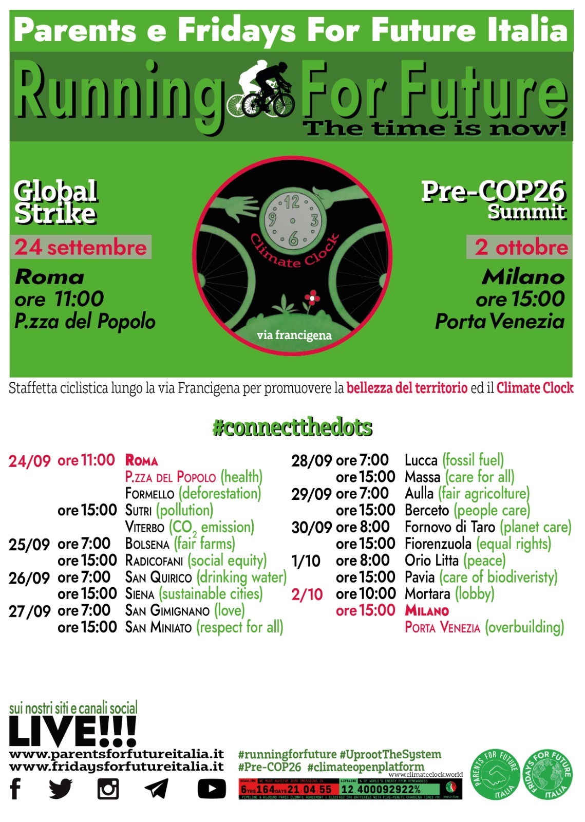 Il 24 settembre a Roma e il 2 ottobre a Milano si terrà la staffetta ciclistica lungo la via francigena Running for future. The time is now!. L’evento‚ organizzato da Parents e Fridays for Future Italia‚ mira a promuovere le bellezze del territorio e il Climate Clock. Il 24 settembre a Roma‚ in occasione del Global Strike‚ alle ore 11.00 in Piazza del Popolo‚ inizierà la staffetta ciclistica “Running for Future. The time is now!”. Il 2 ottobre‚ contestualmente alla chiusura del Pre-COP26 summit‚ alle ore 15.00 in Porta Venezia a Milano‚ si terrà l’evento di chiusura della staffetta ciclistica. Si tratta di due importanti iniziative‚ che puntano alla promozione delle bellezze del territorio e alla sensibilizzazione sul Climate Clock e la lotta al cambiamento climatico.