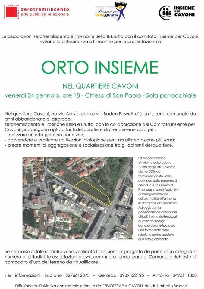 Le associazioni zerotremilacento e Frosinone Bella & Brutta insieme con il comitato Insieme per Cavoni invitano la cittadinanza all’incontro di presentazione del progetto Orto insieme.