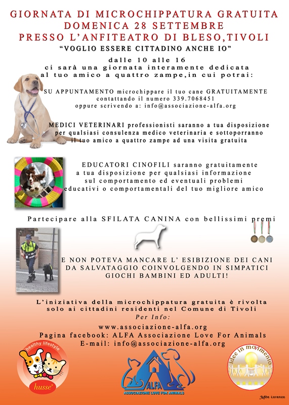 ALFA‚ Associazione Love For Animals‚ organizza per domenica 28 settembre 2014 l’iniziativa Voglio essere Cittadino anche Io. Appuntamento a Tivoli presso l’anfiteatro di Bleso dalle ore 10.00 alle 17.00 con tante iniziative dedicate agli animali ed ai loro padroni. Previo appuntamento‚ sarà possibile microchippare gratuitamente il proprio cane‚ inoltre‚ per tutta la giornata medici veterinari ed educatori cinofili saranno a disposizione per consulenze gratuite.