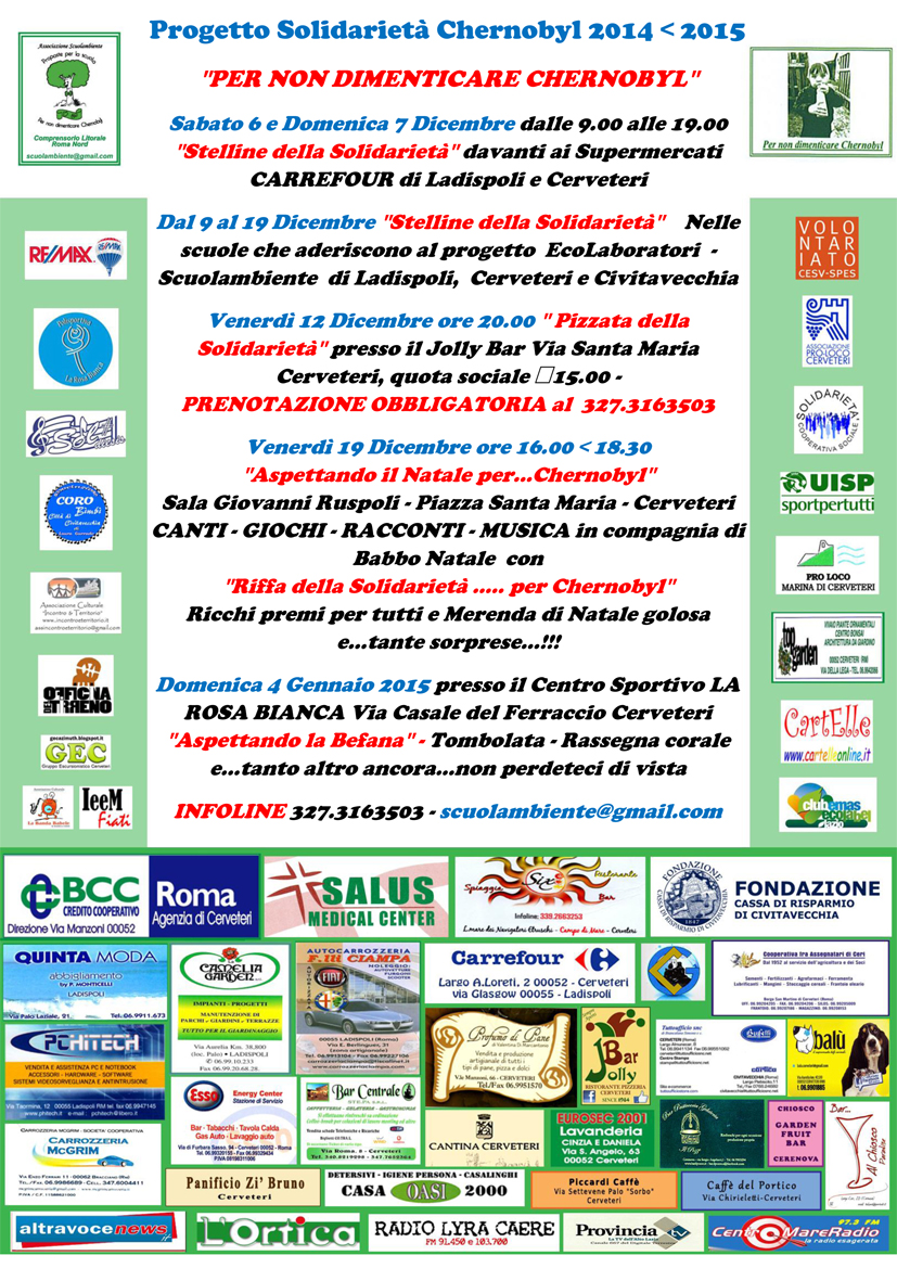 Al via il Progetto Solidarietà Chernobyl 2014–2015 dal titolo Per non dimenticare Chernobyl promosso dall’associazione Scuolambiente. Gli appuntamenti partono il weekend del 6–7 dicembre 2014 a Ladispoli e Cerveteri (RM)‚ dove dalle ore 9.00 alle 19.00‚ davanti ai supermercati‚ ci saranno le Stelline della Solidarietà.