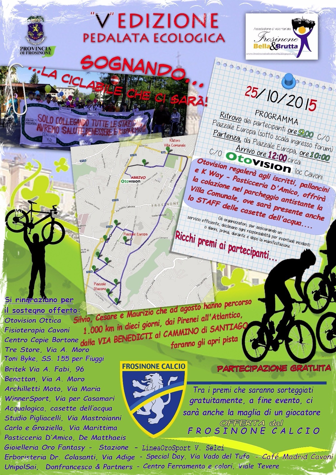 L’associazione Frosinone Bella & Brutta organizza la Va edizione della Pedalata Ecologica quest’anno intitolata Sognando... la ciclabile che ci sarà prevista per domenica 25 ottobre a partire dalle ore 09.00.