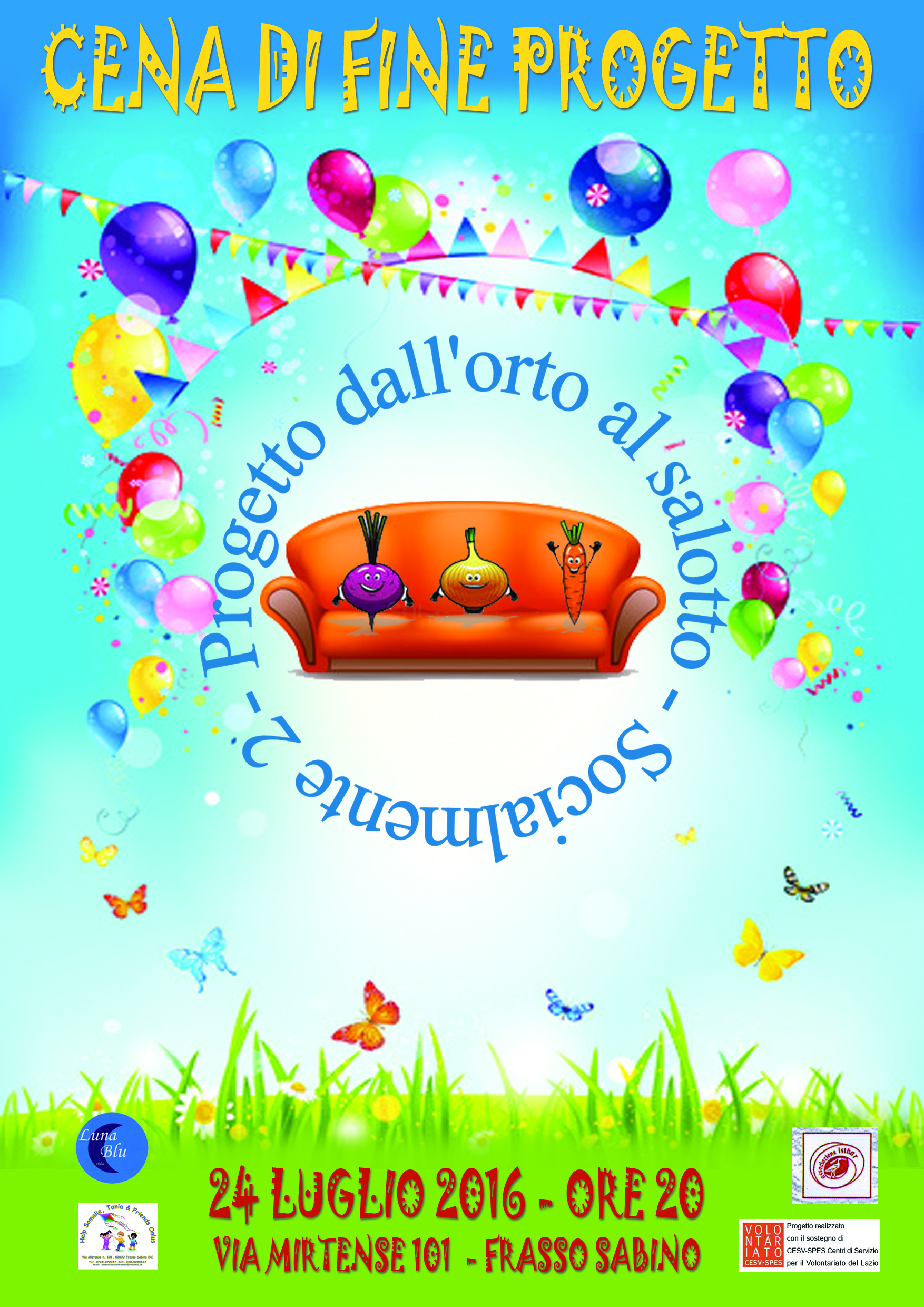 Si terrà domenica 24 luglio alle 20.00 la Cena per la chiusura del progetto Dall'Orto al Salotto. Una cena per volontari ed utenti che hanno realizzato le attività ed in particolare l’orto sociale a Frasso Sabino gestito dall’associazione Help Somalie‚ Tania & Friends in collaborazione con l'associazione Luna Blu e l'associazione Isthar. La cena si terrà in Via Mirtense‚ 101 a Frasso Sabino.
