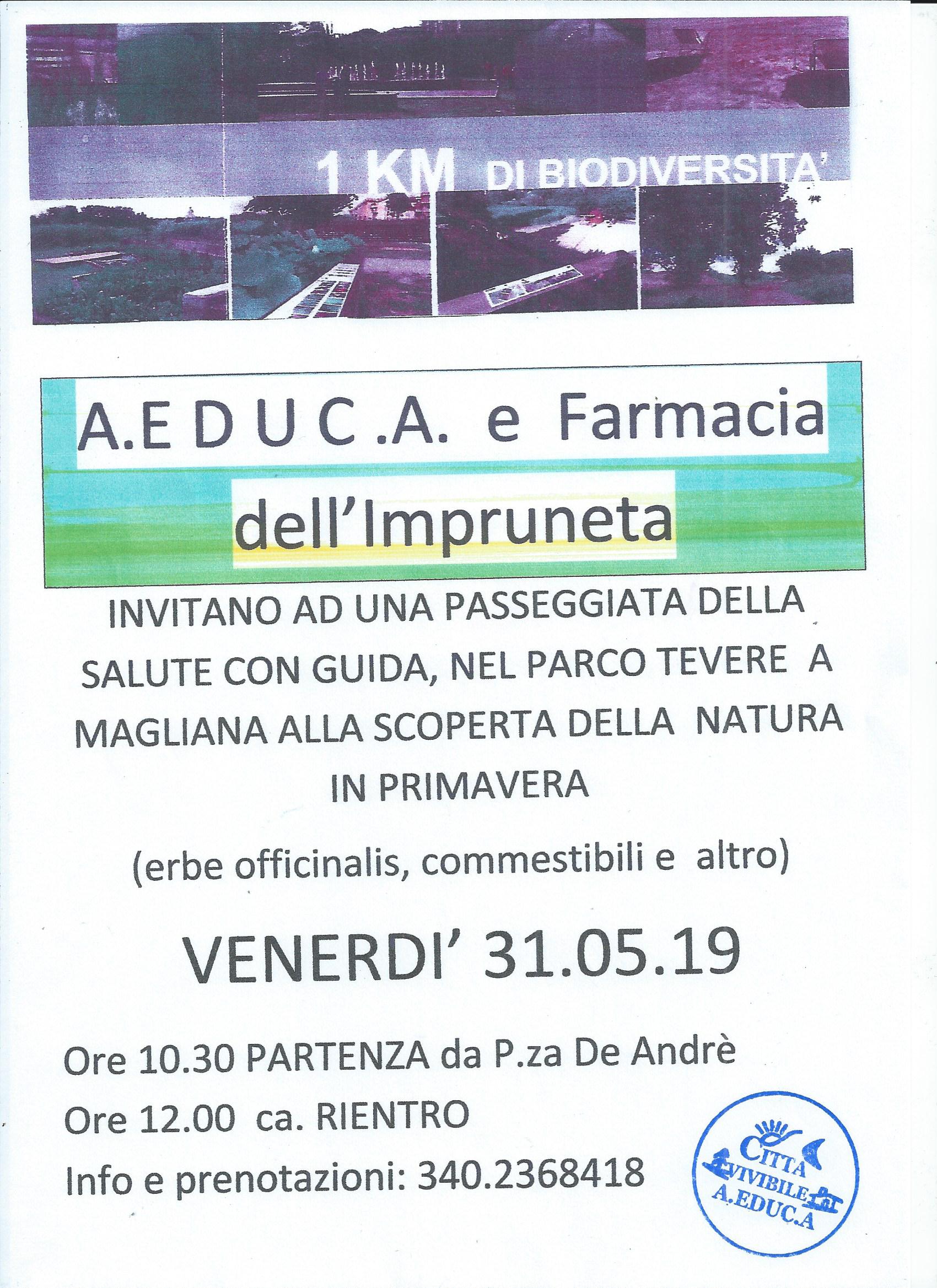 L'associazione AEDUCA in collaborazione con la Farmacia dell'Impruneta invitano a partecipare alla passeggiata della salute 1 km di Biodiversità. Una guida accompagnerà i partecipanti nel Parco del Tevere a Magliana alla scoperta della natura in primavera. La passeggiata si svolgerà venerdì 31 maggio con partenza da Piazza De Andrè dalle 10.30 con rientro previsto per le 12.00. Per informazioni e prenotazioni chiama il 340.2368418