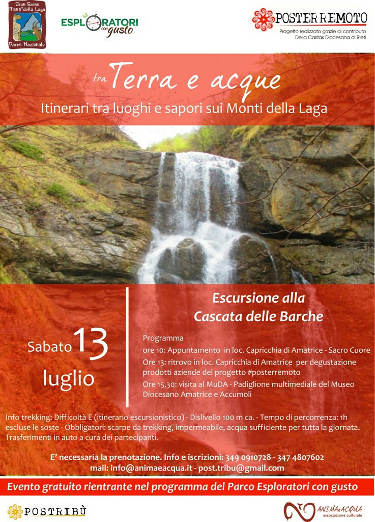Appuntamento‚ sabato 13 luglio 2019‚ per un po’ di trekking alla scoperta delle cascate delle Barche‚ nel Parco Nazionale Gran Sasso e Monti della Laga. L’appuntamento è alle ore 10.00 presso il Sacro Cuore in località Capricchia (una frazione di Amatrice). Da qui lungo il sentiero‚ accessibile anche ai bambini‚ si arriverà alla cascata formata dal fosso del Solagna. Al rientro ci sarà un momento di ristoro con prodotti offerti dalle aziende del progetto #posterremoto‚ a cura della Proloco di Capricchia. La giornata prosegue poi ad Amatrice‚ presso il padiglione multimediale del futuro Museo diocesano di Amatrice e Accumoli – MuDA‚ dove sarà possibile visitare un interessante percorso d’arte sacra. L’evento è gratuito (ma è necessario prenotare) e rientra nel programma del Parco Gran Sasso Monti della Laga “Esploratori con gusto” e nel più ampio Progetto Posterremoto‚ realizzato grazie al contributo della Caritas diocesana di Rieti e di tanti donatori da tutta Italia‚ che punta alla ricostruzione di un tessuto economico e sociale saldo nelle aree colpite dagli eventi sismici del 2016. Obbligatorie scarpe da trekking e acqua sufficiente per tutta la mattinata. Per altre informazioni e per le iscrizioni: 349.0910728 - 347.4807602‚ email info@animaeacqua.it‚ post.tribu@gmail.com. Per maggiori informazioni visita il sito