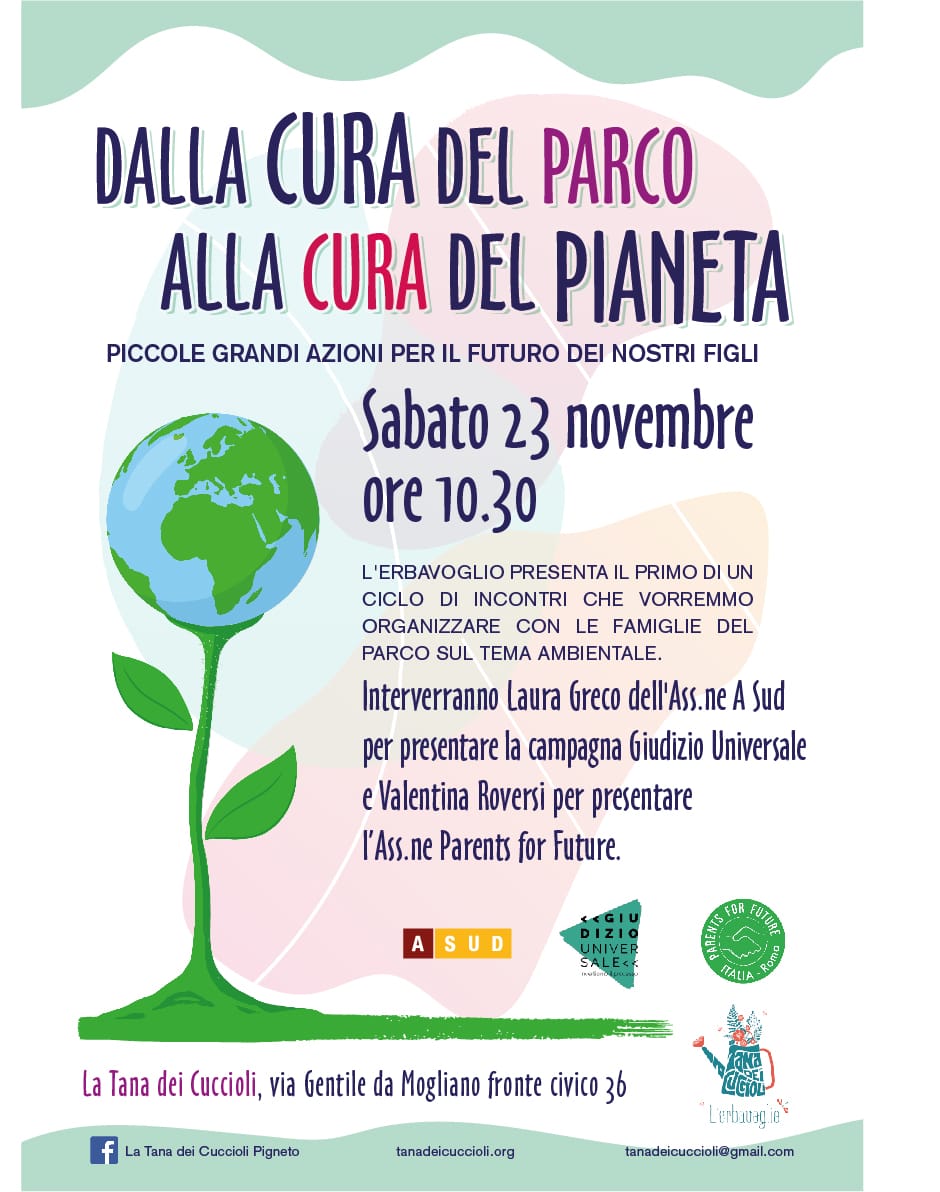 Sabato 23 novembre alle ore 10.30 l'associazione L'Erbavoglio presenta il primo di un ciclo di incontri che ci piacerebbe organizzare con le famiglie e la comunità del parco sul tema ambientale. L'incontro‚ organizzato dalla Tana dei cuccioli‚ si terrà Via Gentile da Mogliano (fronte civico 3) in zona Pigneto a Roma. In caso di pioggia l'evento verrà rimandato