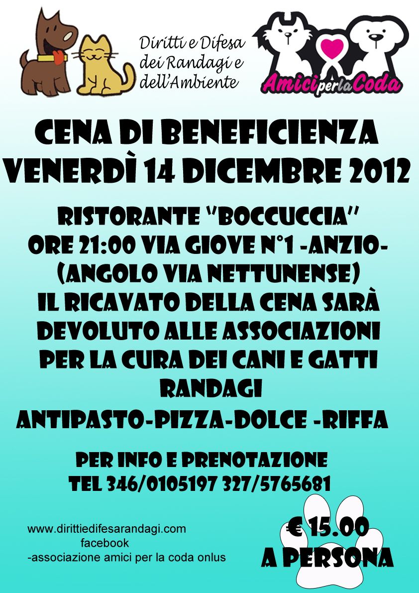 Si svolgerà venerdì 14 dicembre 2012 la Cena di beneficienza promossa dalle associazioni Diritti e Difesa dei Randagi e dell’Ambiente e Amici per la Coda.