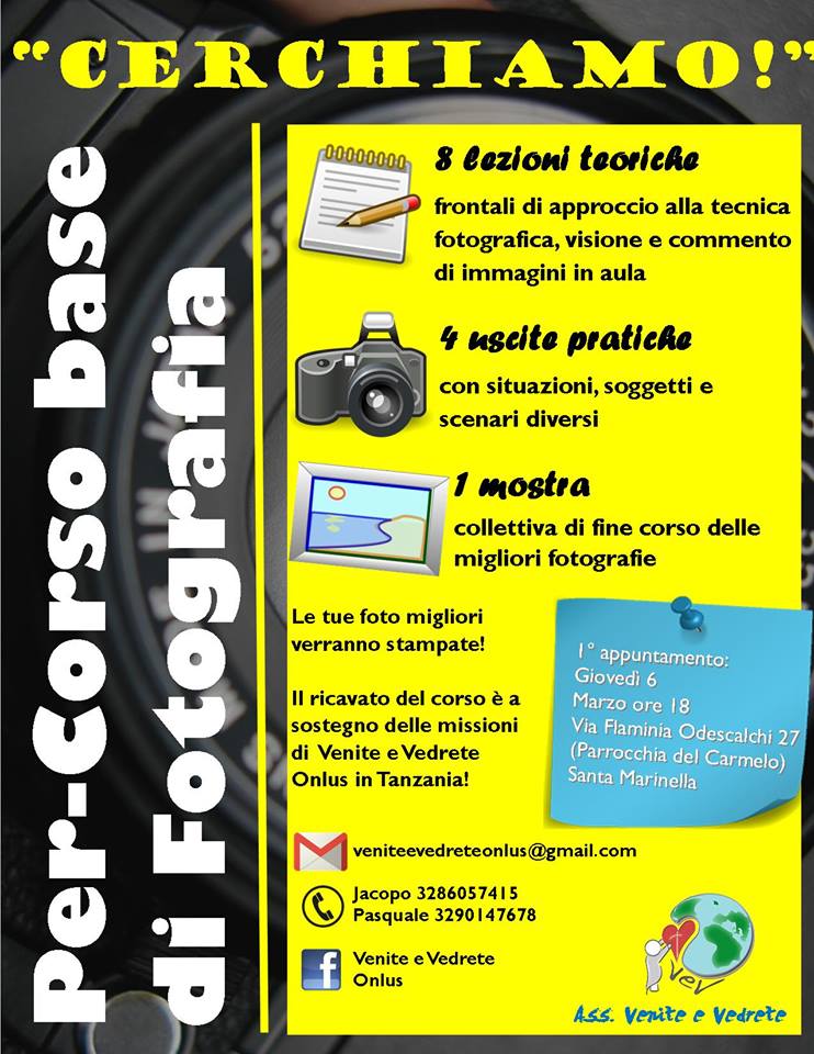 Cerchiamo!: corso base di fotografia a Santa Marinella Promosso dall’associazione VeV (Venite e Vedrete) Onlus Cerchiamo!. Ecco il per–corso base di fotografia promosso a Santa Marinella (RM) dall’associazione VeV (Venite e Vedrete) Onlus e in partenza giovedì 6 marzo 2014 alle ore 18 presso la Parrocchia del Carmelo in Via Flaminia Odescalchi 27.