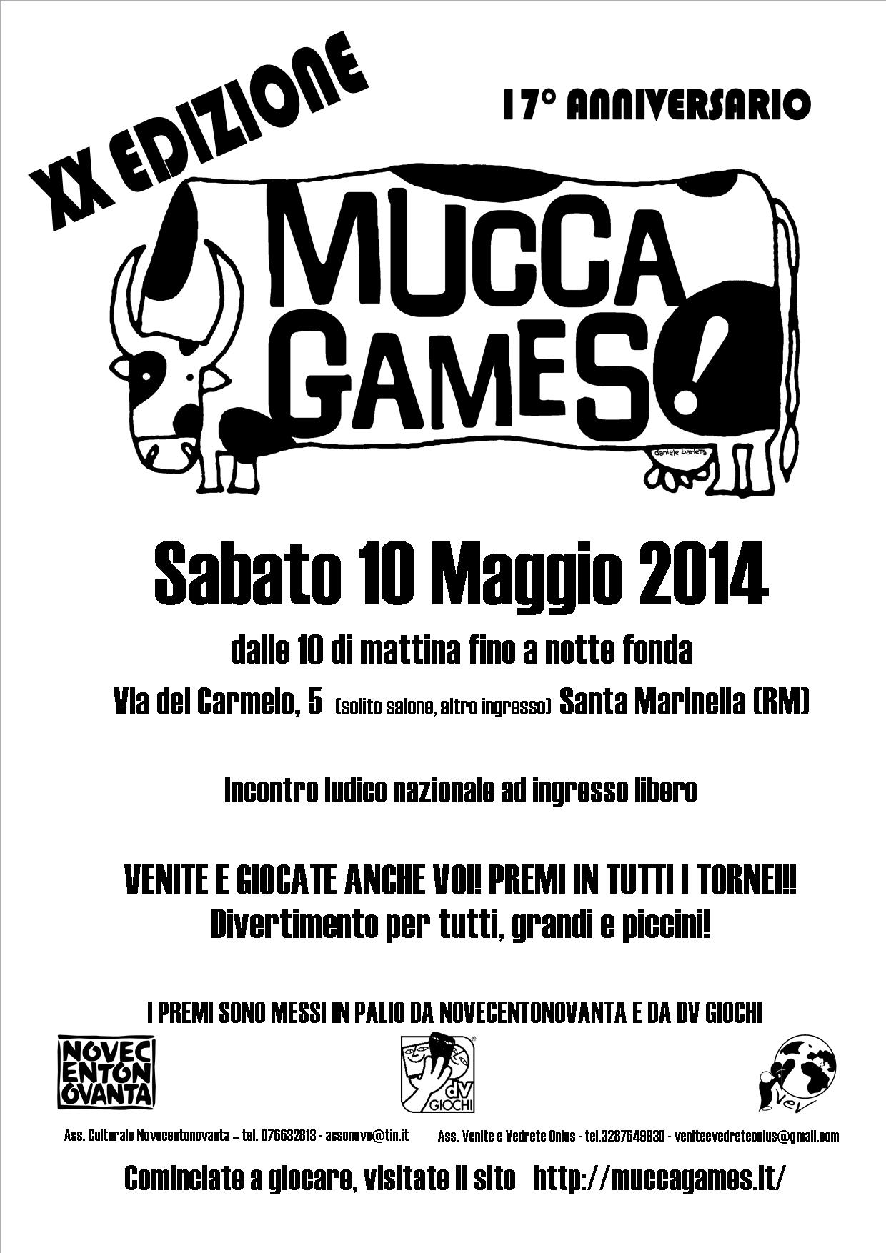 Sabato 10 maggio 2014 a Santa Marinella (RM) dalle 10 di mattina fino a notte fonda si gioca ai Mucca Games!‚ l’incontro ludico nazionale a ingresso libero promosso dalle associazioni Vev (Venite e Vedrete) Onlus e Novecentonovanta‚ in collaborazione con Dv Giochi‚ che quest’anno giunge alla XX edizione.