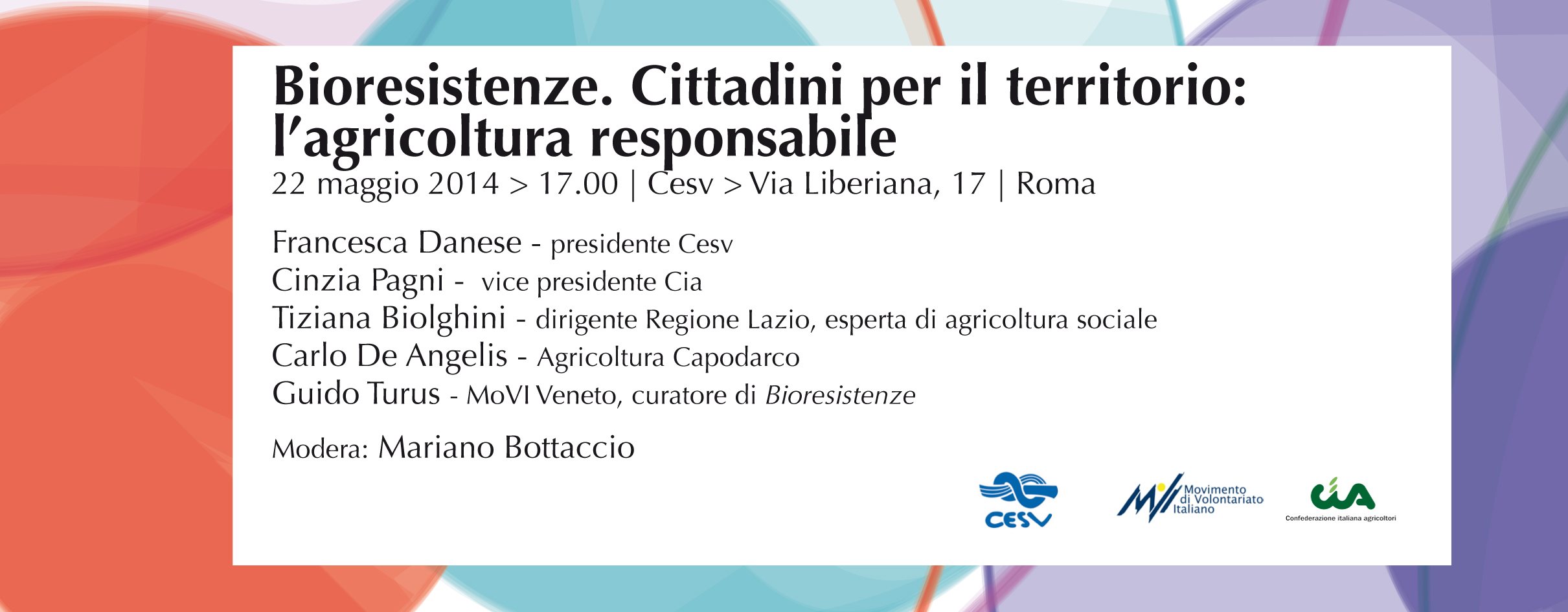 Giovedì 22 Maggio 2014 si svolgerà la presentazione del libro Bioresistenze. Cittadini per il territorio: l’agricoltura responsabile‚ appuntamento dalle ore 17.00 alle 19.00 presso i CSV del Lazio in Via Liberiana‚ 17 a Roma.