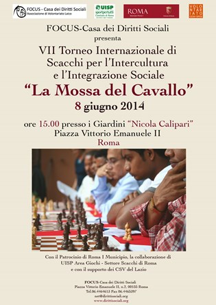 FOCUS Casa dei Diritti Sociali in collaborazione di UISP Area Giochi Settore Scacchi di Roma‚ con il supporto dei CSV del Lazio CESV e SPES e‚ con patrocinio del Municipio I di Roma Capitale‚ presenta la VII Edizione del Torneo Internazionale di Scacchi per l’Intercultura e l’Integrazione Sociale La Mossa del Cavallo.