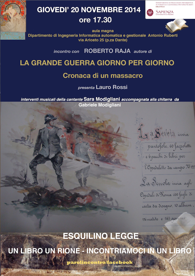Giovedì 20 novembre 2014 alle ore 17:30 a Roma‚ presso il Dipartimento di Ingegneria informatica automatica e gestionale Antonio Ruberti in Via Ariosto 25‚ si terrà l’Incontro con Roberto Raja‚ autore di La Grande Guerra giorno per giorno. Cronaca di un massacro. L’evento è promosso da Parolincontro.