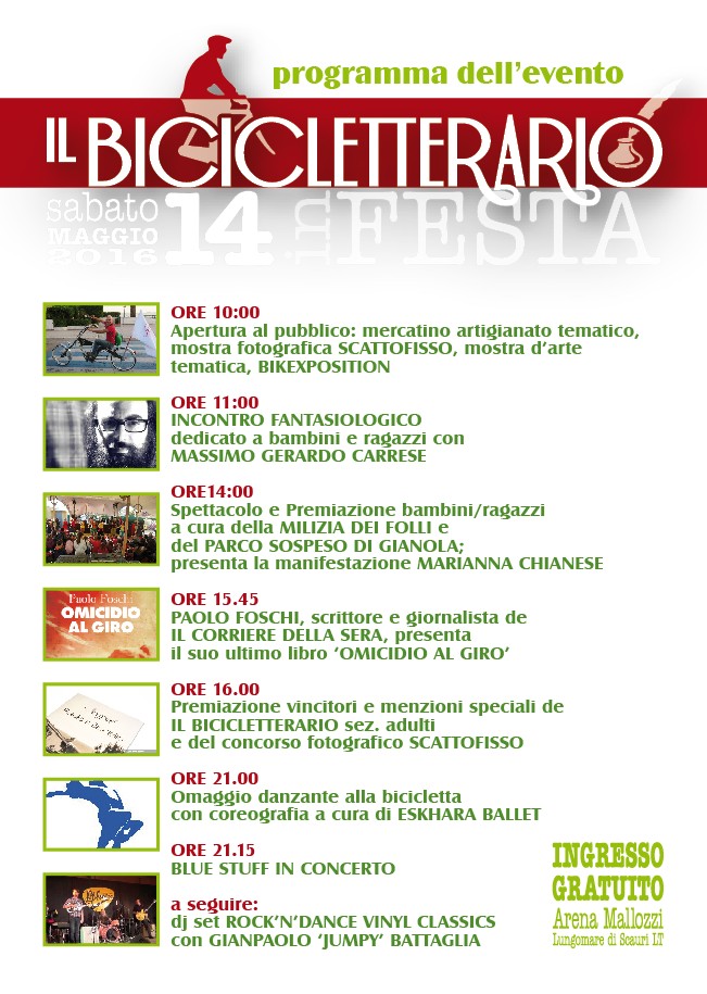 Appuntamento sabato 14 maggio 2016 per Il Bicicletterario in Festa‚ in occasione della conclusione della II edizione de Il Bicicletterario‚ unico premio letterario al mondo dedicato alla bicicletta‚ all'insegna di cultura‚ arte‚ musica e sostenibilità. Tante le iniziative che dalle ore 10.00 del mattino fino a tarda sera animeranno l’Arena Mallozzi‚ sul lungomare di Scauri (Minturno): tra queste un mercatino dell'artigianato con creazioni ispirate alla bicicletta‚ la mostra fotografica legata al Premio Internazionale di Fotografia 'Scattofisso'‚ una mostra d'arte‚ anch'essa tematica‚ e Bikexposition un'esposizione di biciclette particolari‚ vintage‚ strane o semplicemente belle. L'allestimento ospiterà anche i gazebo informativi di Co.S.Mo.S. e Il Bicicletterario‚ della Pro Loco ed altre associazioni e di Amnesty International. Segui l’iniziativa anche sulla pagina facebook dell'evento Per altre info‚ l'indirizzo e-mail di riferimento è cosmosminturno@gmail.com