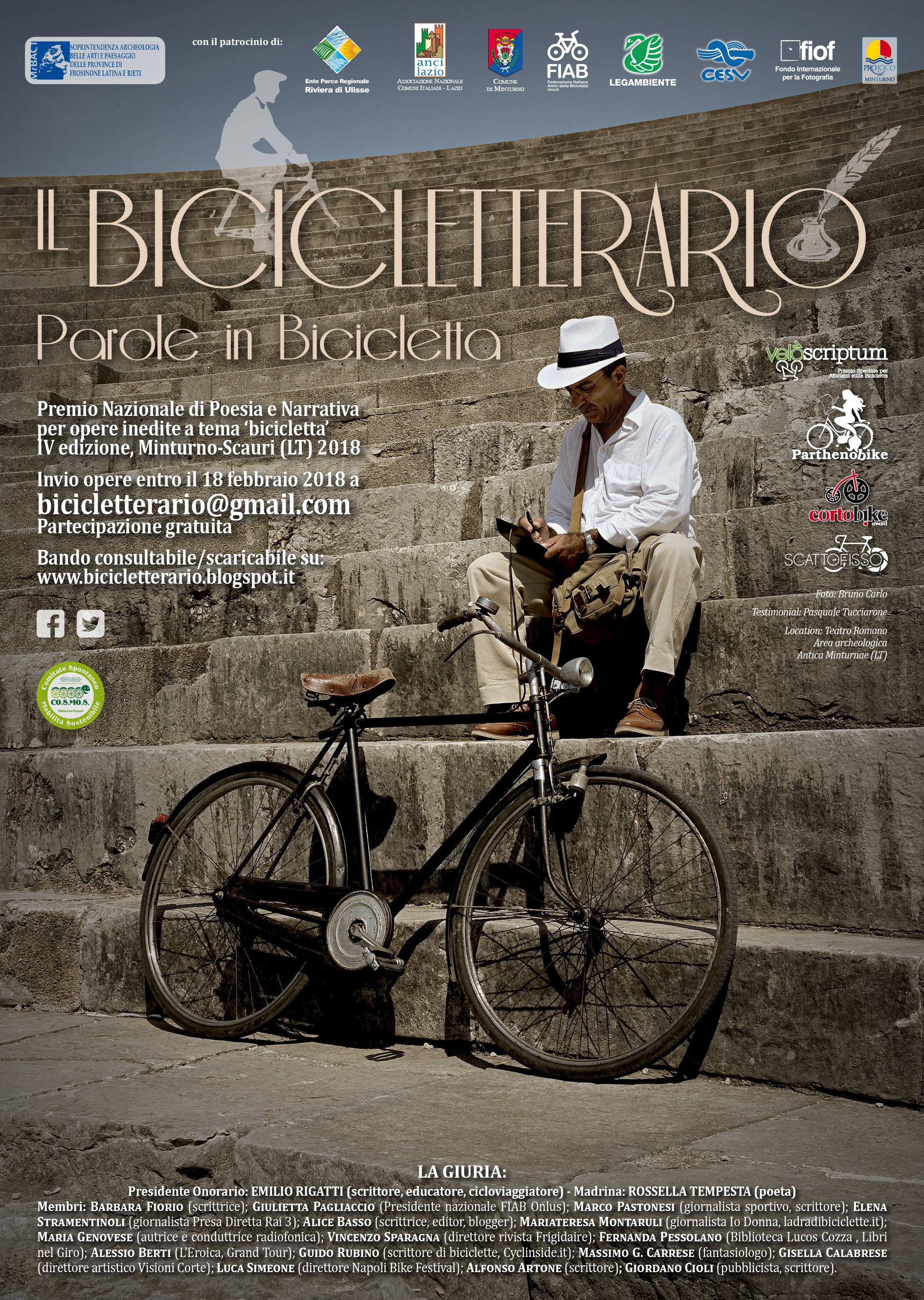 Prende il via la quarta edizione del premio letterario Bicicletterario – Parole in Bicicletta‚ l’unico Premio letterario al mondo dedicato alla bicicletta. L’iniziativa ha registrato una continua crescita‚ raggiungendo ogni angolo d’Italia e superando più volte i confini del Bel Paese. 232‚ 415 e 427 gli autori che‚ fanno sapere gli organizzatori‚ hanno partecipato rispettivamente alla prima‚ seconda e terza edizione. Diverse le sezioni in concorso: poesie/adulti‚ racconti/adulti‚ miniracconti/adulti‚ poesie/ragazzi‚ racconti/ragazzi‚ poesie/bambini e racconti/bambini. La novità è rappresentata dalla sezione VelòScriptum‚ riguardante gli aforismi sulla bicicletta‚ sviluppati in una manciata di caratteri‚ un'unica frase o anche due/tre concatenate a formare un periodo di senso compiuto‚ che siano originali e inedite. Le frasi originali più belle potrebbero diventare le didascalie di magnifiche cartoline o altri tipi di gadget realizzati in collaborazione tra Il Bicicletterario e il Napoli Bike Festival per promuovere la mobilità sostenibile e l'uso quotidiano della bici. Riconfermata quest’anno la sezione speciale di Visioni Corte Film Festival‚ per cortometraggi a tema bicicletta‚ in collaborazione con la Direzione dell'importante manifestazione cinematografica internazionale. La partecipazione al concorso letterario è totalmente gratuita e aperta a tutti. La scadenza per l’invio delle opere è fissata entro e non oltre il 18 febbraio 2018. Queste possono essere inviate a bicicletterario@gmail.com (Segreteria del Premio)‚ secondo le indicazioni presenti nel bando e naturalmente entro la data limite. Le premiazioni si terranno nei primi giorni del giugno 2018 nel Comune di Minturno (LT)‚ nell’ambito di una festa dedicata alla bicicletta nei suoi vari aspetti. Anche quest’anno viene riconfermato il premio speciale Phartenobike‚ sempre in partnership con il Napoli Bike Festival‚ per tutte le opere che avranno riferimenti sociali‚ culturali‚ geografici al capoluogo campano e ai suoi dintorni‚ le quali in ogni caso parteciperanno alle selezioni per i premi 'istituzionali' contenuti nel bando: una doppia possibilità‚ quindi. Discorso del tutto simile per il premio speciale L’Eroica‚ dedicato agli elaborati ispirati al mondo delle ciclostoriche e del ciclismo d’epoca: saranno anch’essi oggetto di doppia valutazione‚ grazie al sostegno dell’organizzazione della celeberrima manifestazione. I premi delle sezioni dei bambini e ragazzi presenti nel bando saranno donati invece dal Grand Tour‚ circuito di ciclostoriche e gravel che ha in progetto‚ con la collaborazione del Co.S.Mo.S.‚ di coinvolgere vari comuni sparsi per l'Italia‚ da Nord a Sud‚ su grandi eventi dedicati alla bicicletta‚ ponendo l'accento sulla sicurezza stradale e sulla cultura‚ soprattutto in ambito scolastico. Tutto questo‚ in forma più tecnica e dettagliata‚ è ben illustrato nel bando della quarta edizione de Il Bicicletterario. La Giuria della quarta edizione è così composta: Presidente Onorario: Emilio Rigatti (scrittore‚ educatore‚ cicloviaggiatore) Madrina: Rossella Tempesta (poeta) Membri (in ordine alfabetico):