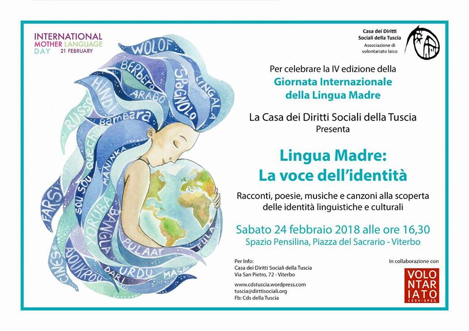 In occasione della IV edizione della Giornata Internazionale della Lingua Madre‚ sabato 24 febbraio 2018 a partire dalle ore 16.30 allo Spazio Pensilina di piazza del Sacrario (Viterbo)‚ appuntamento con racconti‚ poesie‚ musiche e canzoni alla scoperta delle identità linguistiche e culturali. L’incontro‚ dal titolo “La voce dell’identità”‚ è organizzato dalla Casa dei Diritti Sociali della Tuscia. Per maggiori informazioni: Casa dei Diritti Sociali della Tuscia - Via San Pietro‚ 72 (Viterbo)‚ visita il sito dell'associazione o scrivi a: tuscia@dirittisociali.org Seguici su Facebook