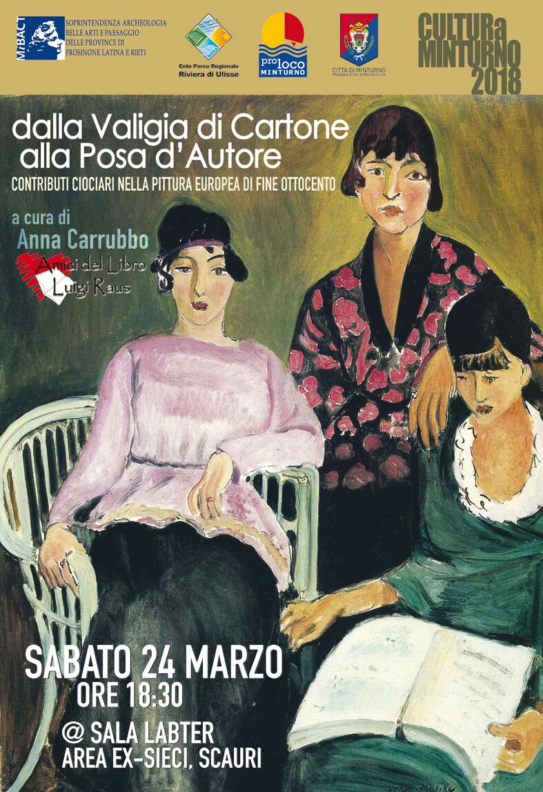 Sabato 24 marzo alle ore 18.30 presso la Sala Labter nell’area Ex-Sieci a Scauri‚ verranno illustrati alcuni dipinti di stampo ciociaro‚ che contribuiscono a dare un quadro completo alla pittura di fine Ottocento‚ nella mostra ‘’Dalla valigia di cartone alla Posa d’autore’’. L’associazione che se ne occupa è Amici del libro Biblioteca Luigi Raus‚ che nasce a Minturno nel 2006 con l'obiettivo di trasformare la piccola biblioteca scolastica‚ presente all'interno della scuola elementare di Minturno‚ in una realtà aperta al territorio e a ogni fascia d'età e capace di colmare il vuoto dell'assenza di una biblioteca comunale. L'Associazione si propone inoltre di organizzare iniziative ed eventi culturali quali teatro‚ poesia e musica privilegiando operatori culturali e artisti espressione del nostro territorio. L’evento è in collaborazione con Mibact‚ la Soprintendenza Archeologia Belle Arti e paesaggio delle province di Frosinone‚ Latina e Rieti; l’Ente Parco Regionale Riviera di Ulisse; e il patrocinio della Città di Minturno e Cultura Minturno 2018. Per info e contatti: 0771.65059 oppure visita il sito dell'associazinone