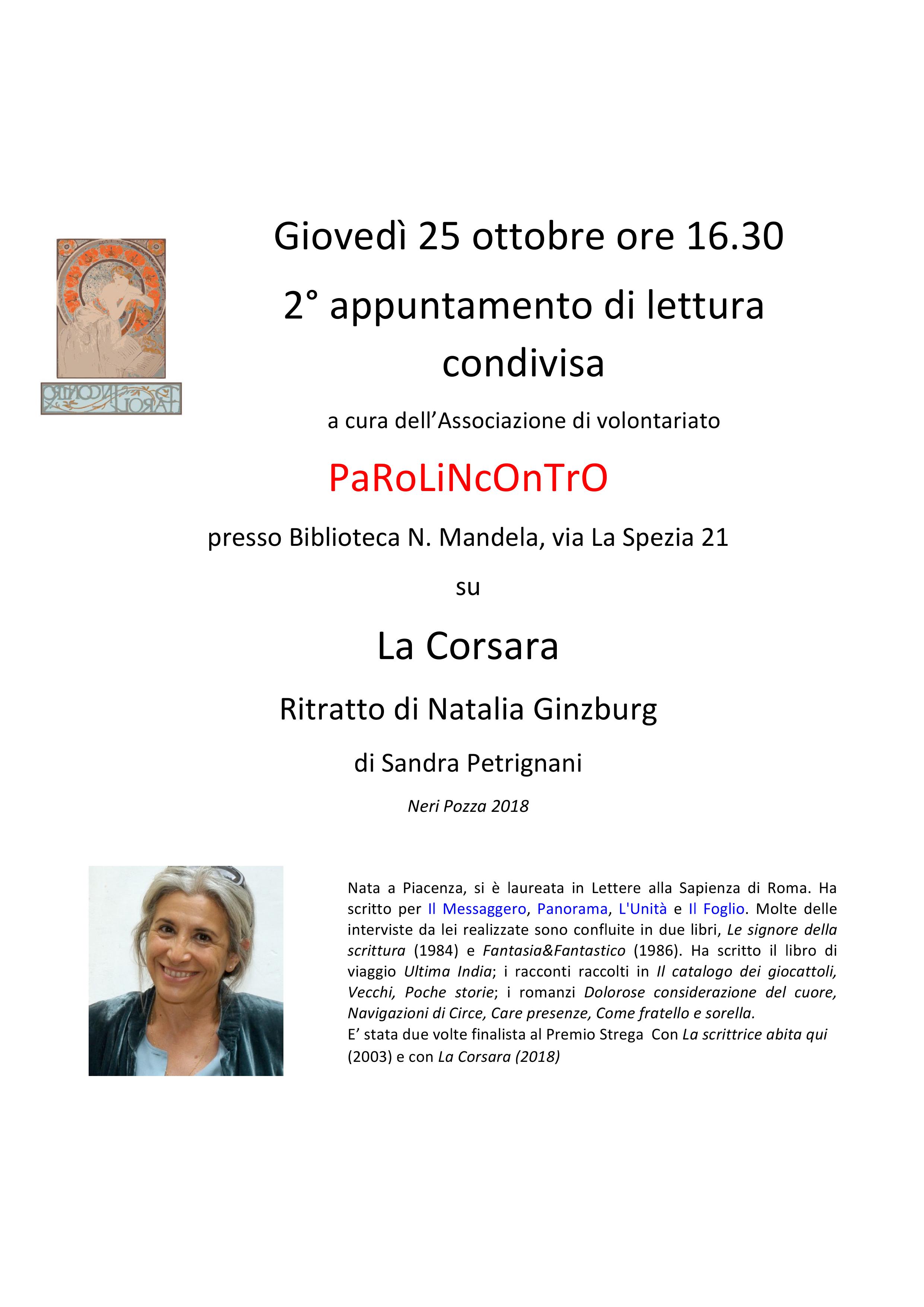 Giovedì 25 ottobre ore 16.30‚ presso la Biblioteca Nelson Mandela‚ in via La Spezia‚ 21 verrà presentato il 2° incontro gruppo di lettura sul libro di S. Petrignani‚ "La Corsara"‚ a cura dell’associazione di volontariato Parolincontro.