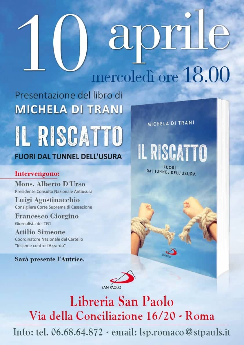 Il riscatto. Fuori dal tunnel dell’usura è il titolo del libro di Michela di Trani che verrà presentato mercoledì 10 aprile alle 18.00‚ presso la Libreria San Paolo in Via della Conciliazione‚ 16/20 a Roma. Oltre all’autrice‚ interverranno Mons. Alberto D’Urso‚ presidente della Consulta Nazionale Antiusura‚ Luigi Agostinacchio‚ consigliere della Corte di Cassazione; Francesco Giorgino‚ giornalista del TG1; Attilio Simeone‚ coordinatore nazionale del cartello “Insieme contro l’Azzardo”. Michela Di Trani‚ giornalista‚ è addetta stampa della Consulta Nazionale Antiusura “Giovanni Paolo II”. Ha Pubblicato anche il libro-inchiesta “Usura‚ Paura e Misericordia” (Bari‚ 2015). Per altre informazioni sul libro leggi l'articolo su Reti Solidali