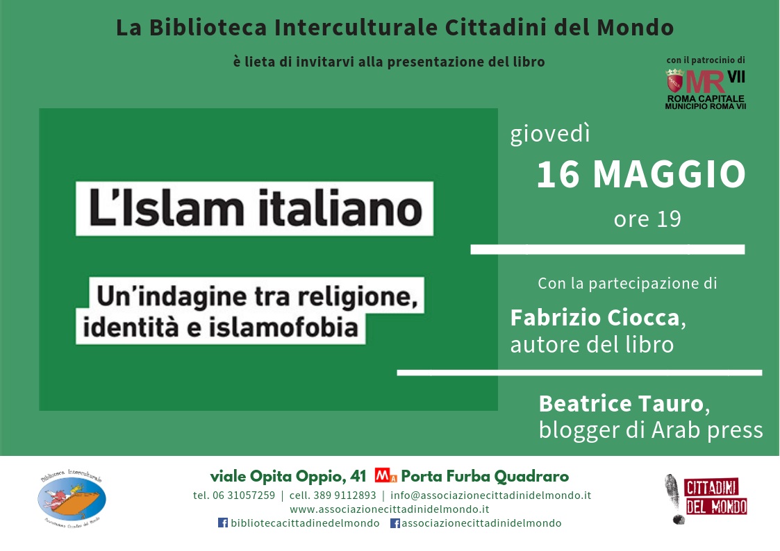 Giovedì 16 Maggio alle ore 19.00 la Biblioteca Interculturale Cittadini del Mondo in Viale Opita Oppio‚ 41 ospiterà la presentazione del libro “L’Islam italiano. Un’indagine tra religione‚ identità e islamofobia” di Fabrizio Ciocca‚ edito da Meltemi Editore‚ modererà l’incontro Beatrice Tauro‚ blogger di Arab Press. Oggi‚ in Italia‚ l’Islam è la seconda religione del Paese‚ con due milioni e mezzo di fedeli‚ di cui oltre un milione di cittadinanza italiana. Una presenza stabile‚ permanente‚ seppur minoritaria‚ che tuttavia una parte dell’opinione pubblica‚ maggioritaria‚ ritiene non compatibile con la società. Partendo da questo scenario‚ l’autore‚ sulla base dei dati emersi da una ricerca condotta su Facebook su un campione di oltre trecento musulmani e diverse interviste‚ presenta i principali bisogni che la minoranza islamica esprime e le problematiche con cui deve relazionarsi. Religione‚ identità‚ islamofobia: lungo queste tre tematiche passa il processo di “normalizzazione” che lo Stato italiano e le comunità islamiche dovranno affrontare insieme.