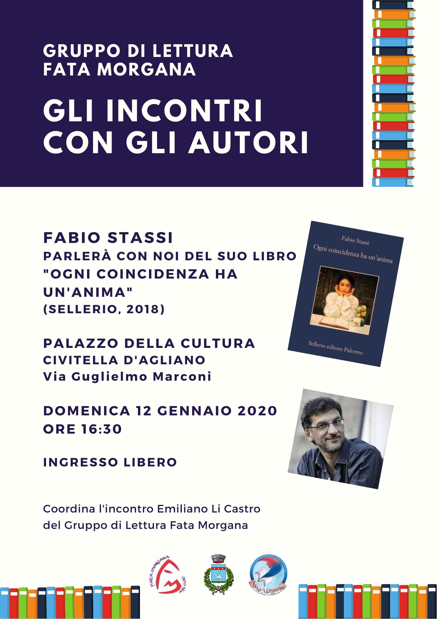 L'Associazione Fata Morgana ODV è invita all'Incontro con l'autore‚ organizzato dal Gruppo di lettura Fata Morgana. Nel corso dell'incontro previsto per domenica 12 gennaio 2020 alle 16.30 presso il Palazzo della Cultura di Civitella d'Agliano (VT)‚ lo scrittore Fabio Stassi parlerà del suo romanzo "Ogni coincidenza ha un'anima" (Sellerio‚ 2018).