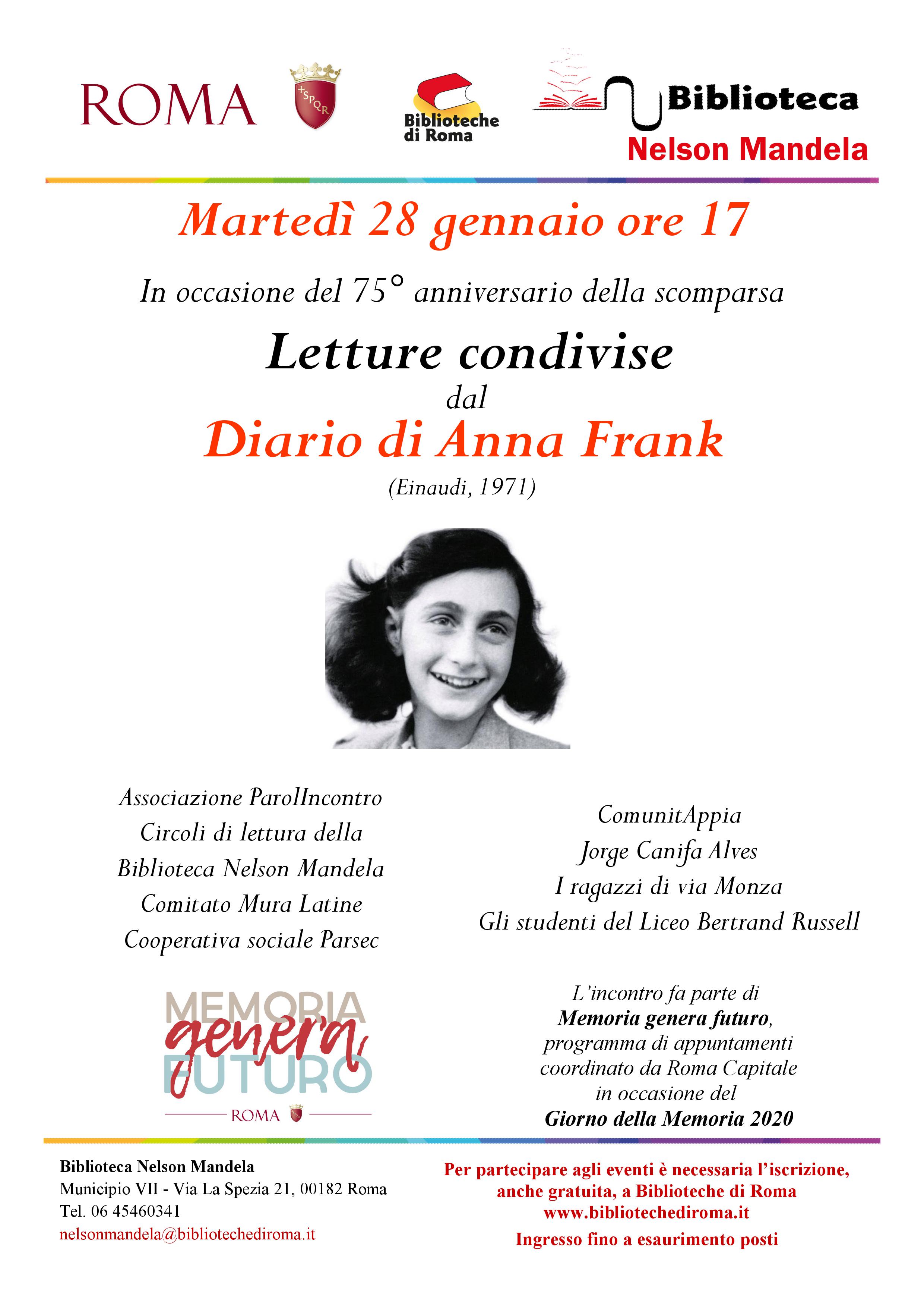 In occasione del 75° anniversario della scomparsa‚ l'associazione Parolincontro organizza la lettura condivisa dal Diario di Anna Frank. L'incontro‚ che si terrà martedì 28 gennaio alle ore 17.00 presso la Biblioteca Nelson Mandela‚ fa parte di Memoria Genera Futuro‚ programma di appuntamenti coordinato da Roma Capitale in occasione del Giorno della Memoria 2020 La lettura è organizzata in collaborazione con i Circoli di lettura della Biblioteca Nelson Mandela‚ il Comitato Mura Latine‚ la Cooperativa sociale Parsec‚ ComunitAppia‚ Jorge Canifa Alves‚ I ragazzi di Via Monza e gli studenti del Liceo Bertrnad Russel. La Biblioteca Nelson Mandela si trova in Via La Spezia‚ 21. Per partecipare agli eventi è necessaria l'iscrizione‚ anche gratuita‚ a Biblioteche di Roma. L'ingresso è fino ad esaurimento dei posti disponibili.