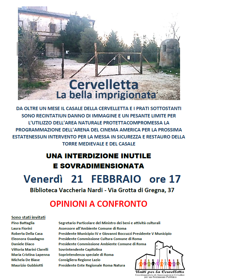 Il Coordinamento Uniti per la Cervelletta ha fissato per venerdì 21 febbraio alle ore 17.00 presso la Biblioteca della Vaccheria Nardi‚ il nuovo incontro “Cervelletta‚ la bella imprigionata”. Si tratta di un incontro che ha lo scopo di chiarire i motivi dell’immobilità della Pubblica Amministrazione sul tema del salvataggio della Torre medievale e del Casale seicentesco. Da oltre un mese il Casale della Cervelletta e i prati sottostanti sono recintati. Un danno d'immagine e un pesante limite per l’utilizzo del parco. Nessun intervento è stato programmato per la messa in sicurezza della Torre medievale e del Casale. Le Istituzioni interessate hanno dato risposte contraddittorie e controproducenti. Alla diffida del Ministero per i Beni e le Attività Culturali a provvedere al restauro (come da rispetto del Codice dei Beni Culturali) il Comune di Roma ha risposto con una recinzione sovradimensionata dell’area intorno al Casale della Cervelletta e dei prati sottostanti la rupe dove sorge. Questa specie di “gabbia” inibisce l’accesso ad una vasta area del Parco Naturale rendendo pressoché inutili i lavori della Regione Lazio per la costruzione della passerella in legno che permetteva il collegamento pedonale dei quartieri di Tor Cervara‚ Colli Aniene e Tor Sapienza in tutto il periodo dell’anno. È indispensabile un intervento urgente‚ che veda impegnati tutti “i decisori”. All’incontro sono stati invitati a partecipare: Pino Battaglia - Segretario Particolare del Ministro dei beni e attività culturali Laura Fiorini – Assessore all’Ambiente del Comune di Roma Roberta Della Casa - Presidente del IV Municipio Giovanni Boccuzzi - Presidente del V Municipio Eleonora Guadagno – Presidente della Commissione Cultura del Comune di Roma Maria Vittoria Marini Clarelli - Sovrintendenza Capitolina ai Beni Culturali Maria Cristina La Penna – Sovrintendenza Speciale di Roma Michela De Biase - Consigliera Regione Lazio Maurizio Gubbiotti - Presidente Roma Natura