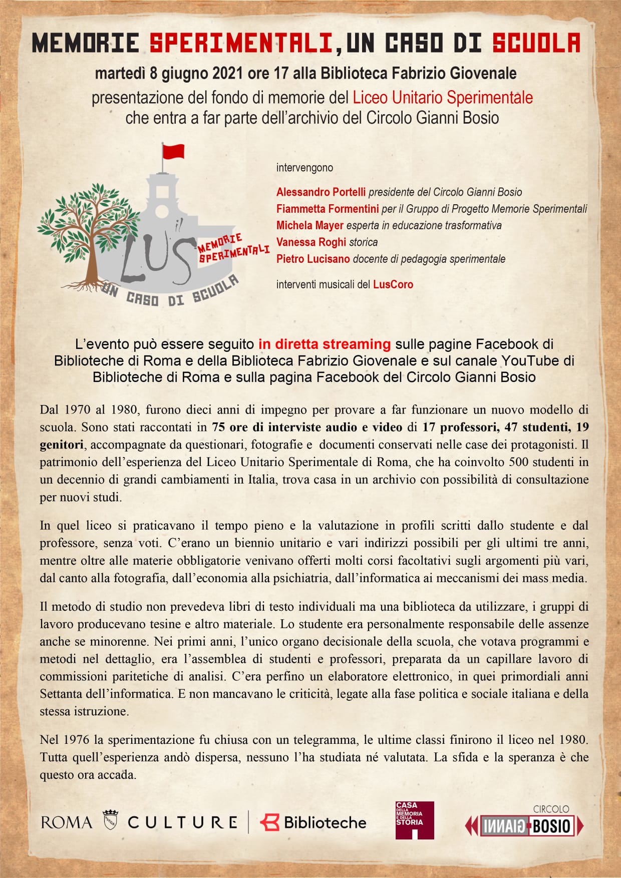 Martedì 8 giugno 2021 alle ore 17.00‚ presso la Biblioteca Fabrizio Giovenale‚ si terrà la presentazione Memorie sperimentali‚ un caso di scuola. Il progetto ha come obiettivo che il fondo di memorie del Liceo Unitario Sperimentale‚ andrà a far parte dell’Archivio del Circolo Gianni Bosio. Gli anni intercorsi tra il 1970 e il 1980 furono segnati dal tentativo di far funzionare un nuovo modello di scuola. Questi anni costituiscono il patrimonio dell’esperienza del Liceo Unitario Sperimentale‚ che li ha raccontati in 75 ore di interviste audio e video di 17 professori‚ 47 studenti e 19 genitori‚ unitamente a questionari‚ fotografie e documenti. Nel 1976 la sperimentazione‚ che prevedeva il tempo pieno e la valutazione in profili scritti dallo studente e dal professore‚ senza voti‚ e in cui oltre alle materie obbligatorie‚ veniva offerta la possibilità di seguire corsi facoltativi su di una grande varietà di argomenti‚ venne chiusa. Le ultime classi finirono il liceo nel 1980. Tutto il patrimonio che questa esperienza ha portato con sé non è stato studiato‚ né valorizzato. La “memoria sperimentale”‚ che ha visto il coinvolgimento di più di 500 studenti in quel decennio‚ trova oggi dimora in un archivio consultabile per i nuovi studi. Interverranno: Alessandro Portelli: Presidente del Circolo Gianni Bosio Fiammetta Formentini: per il Gruppo di Progetto Memorie Sperimentali Michela Mayer: esperta in educazione trasformativa Vanessa Roghi: storica Pietro Lucisano: docente di pedagogia sperimentale Interventi musicali di LusCoro