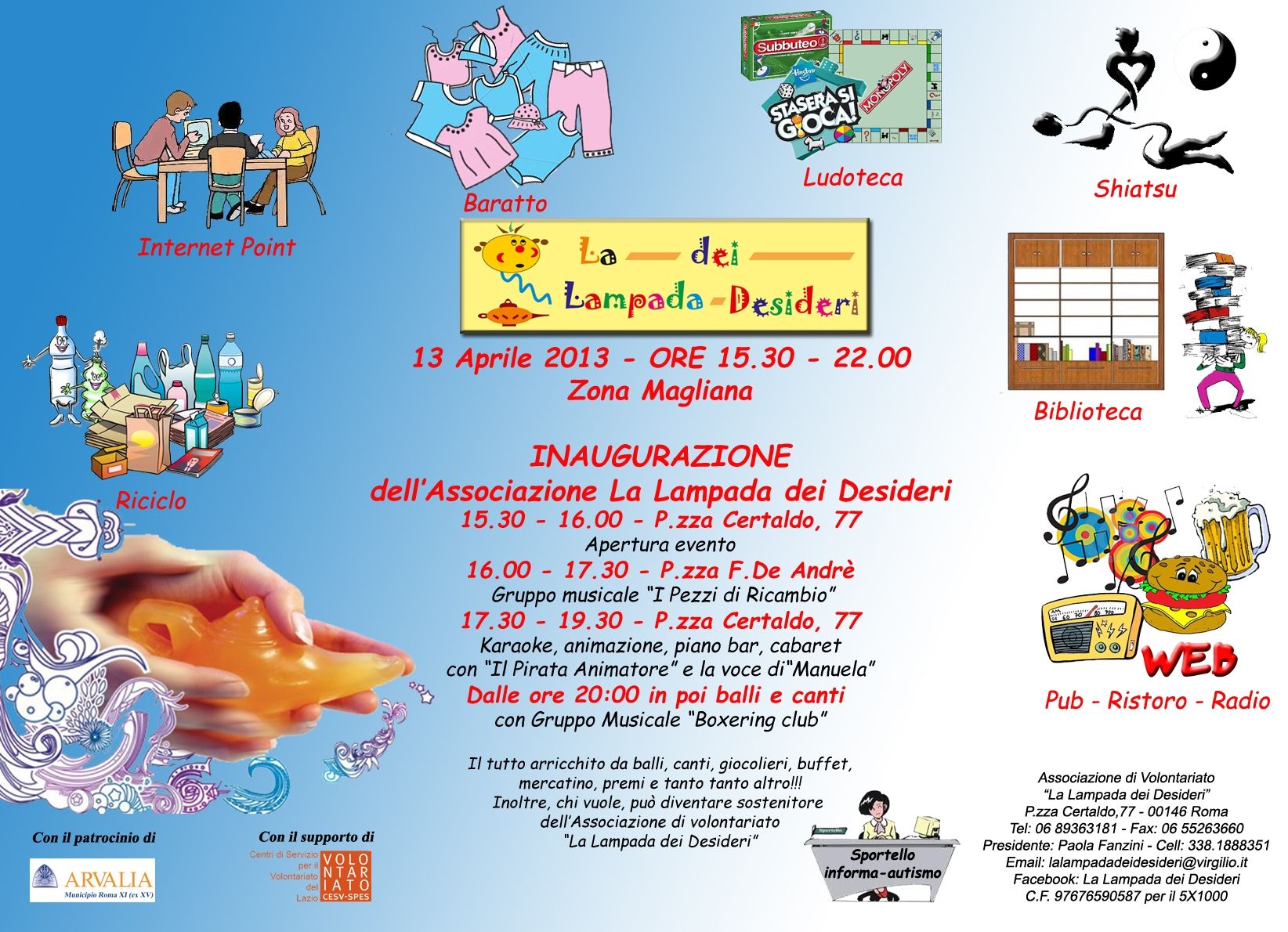 Sabato 13 aprile 2013 verrà inaugurata l’associazione La lampada dei desideri‚ un nuovo punto di riferimento per la cittadinanza.
