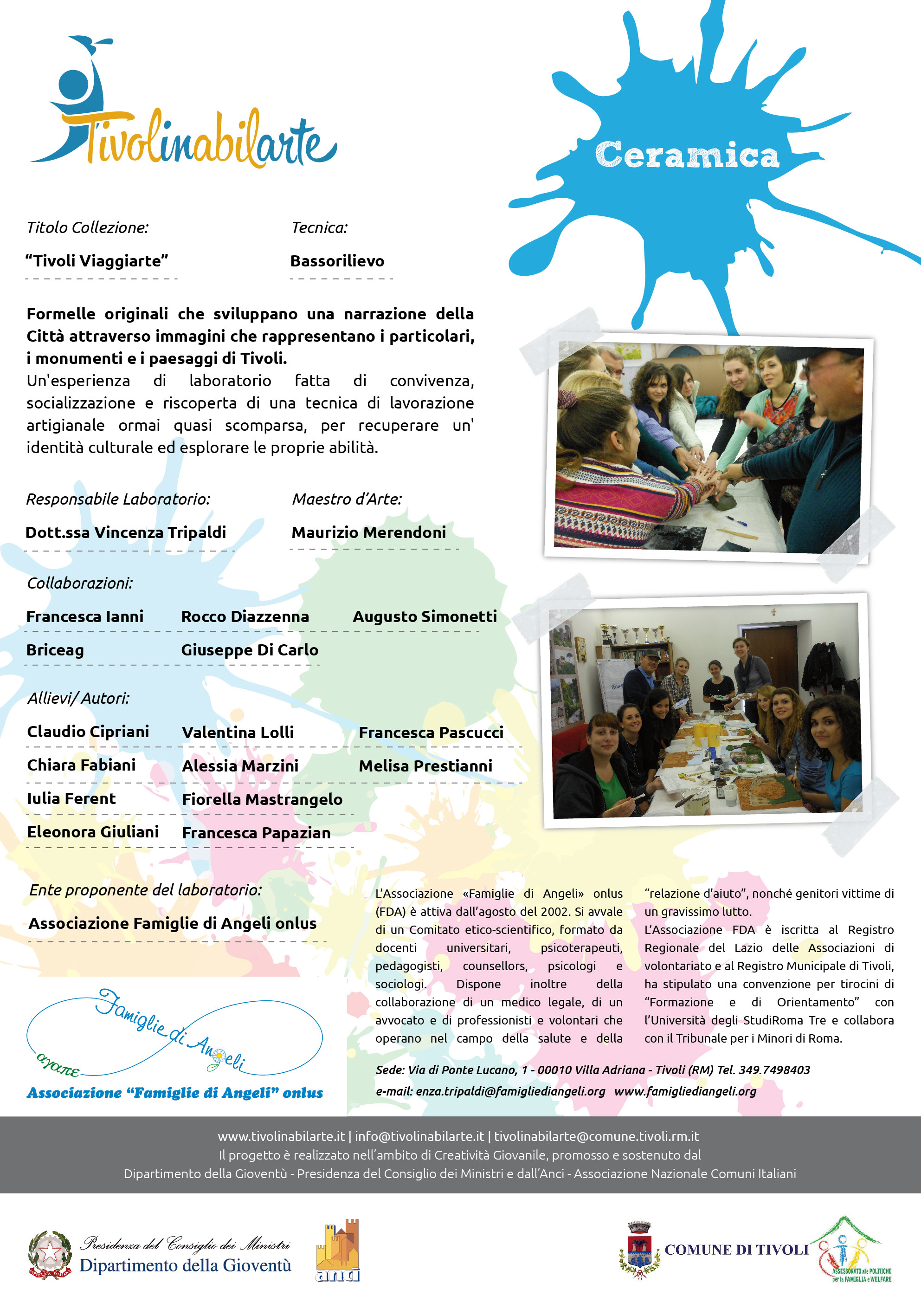 L’associazione Famiglie di Angeli‚ venerdì 6 dicembre 2013‚ dalle ore 9.30‚ presso le Scuderie Estensi in Tivoli‚ espone le ceramiche realizzate da un gruppo di giovani che hanno partecipato al Laboratorio di Ceramica tenutosi presso la sede dell’associazione. Il laboratorio di ceramica è parte del progetto Tivolinabilarte di cui capofila è il Comune di Tivoli.