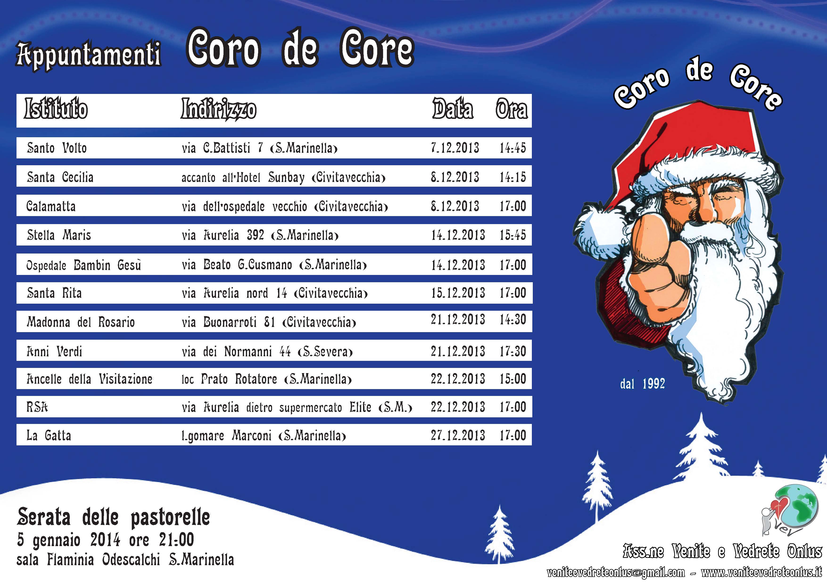 Si esibisce durante le feste il Coro de Core dell’associazione Venite e vedrete di Santa Marinella (Rm) è formato da un gruppo di 40 persone tra adulti e bambini che dal mese di novembre tutti i venerdì sera si riunisce per preparare e provare i canti natalizi accompagnati da chitarre‚ diamonica e kazoo. Durante i venerdì‚ i sabati e le domeniche di dicembre il Coro fa una visita agli Istituti per anziani e disabili presenti sul territorio‚ offrendo auguri in musica‚ allegria ed un piccolo dono personale ai circa 600 anziani e disabili ospiti.