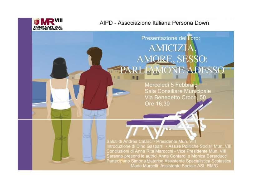 Il Municipio Roma VIII e l’AIPD‚ Associazione Italiana Persona Down‚ invitano alla presentazione del libro Amicizia‚ Amore e Sesso: Parliamone Adesso di Anna Contardi e Monica Berarducci. Appuntamento mercoledì 5 Febbraio 2014 alle ore 16.30 presso la Sala Consiliare del Municipio VIII (ex XI) in Via Benedetto Croce‚ 50 a Roma.