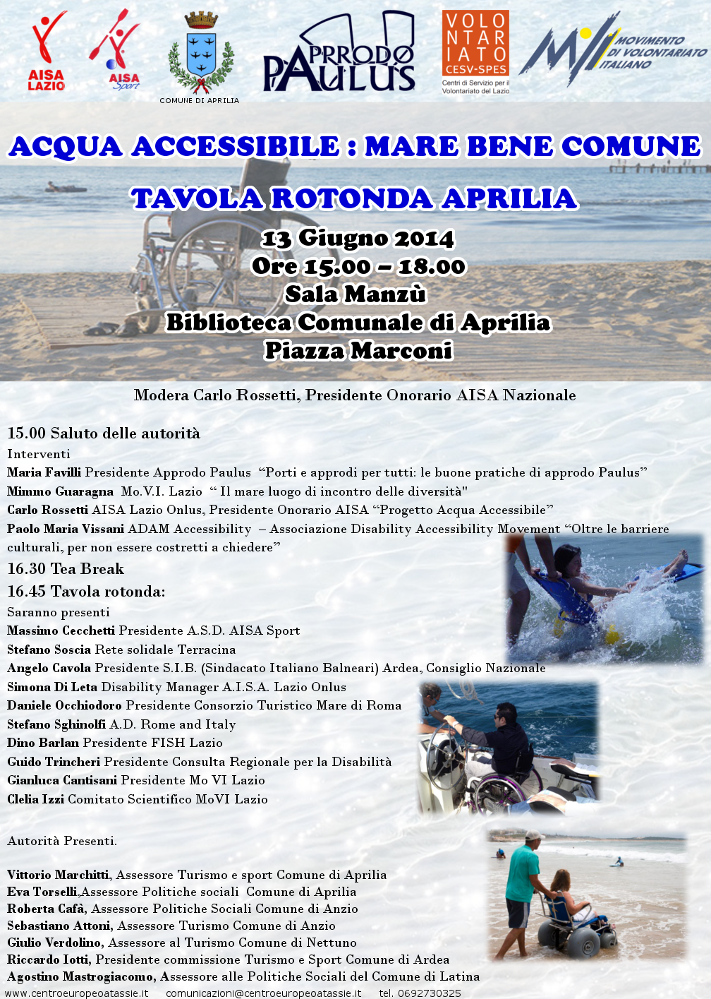 Il mare e l’accessibilità. Dopo l’inaugurazione il 7 giugno del progetto Porti e approdi per tutti ad Aprilia Aisa Lazio‚ Aisa Sport e Movi Lazio in collaborazione con Il Comune di Aprilia‚ Approdo Paulus e CESV e SPES Centri di Servizio per il Volontariato del Lazio organizzano la tavola rotonda Acqua accessibile: mare bene comune.