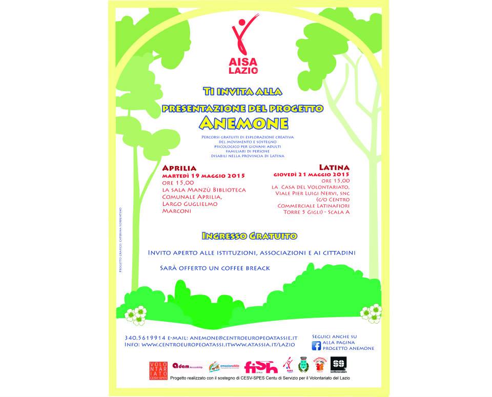 Con il progetto Anemone‚ A.I.S.A. Lazio onlus vuole promuovere percorsi gratuiti di prevenzione del disagio e promozione del benessere in giovani adulti e familiari di persone disabili della provincia di Latina. Per questo‚ nei prossimi mesi‚ al tradizionale impegno dell’associazione‚ in prima linea da oltre vent’anni per promuovere la qualità della vita e l’inclusività‚ favorire l’esigibilità dei diritti e sensibilizzare la popolazione‚ saranno avviate le attività previste dal progetto. Il progetto Anemone sarà presentato in due appuntamenti aperti alle istituzioni‚ alle associazioni ed ai cittadini: ad Aprilia il 19 maggio alle ore 15.00 presso la Sala Manzù della Biblioteca Comunale di Aprilia in Largo Marconi e a Latina il 21 maggio alle ore 15.00 presso la Casa del Volontariato in Viale Nervi‚ Torre 5 Gigli.