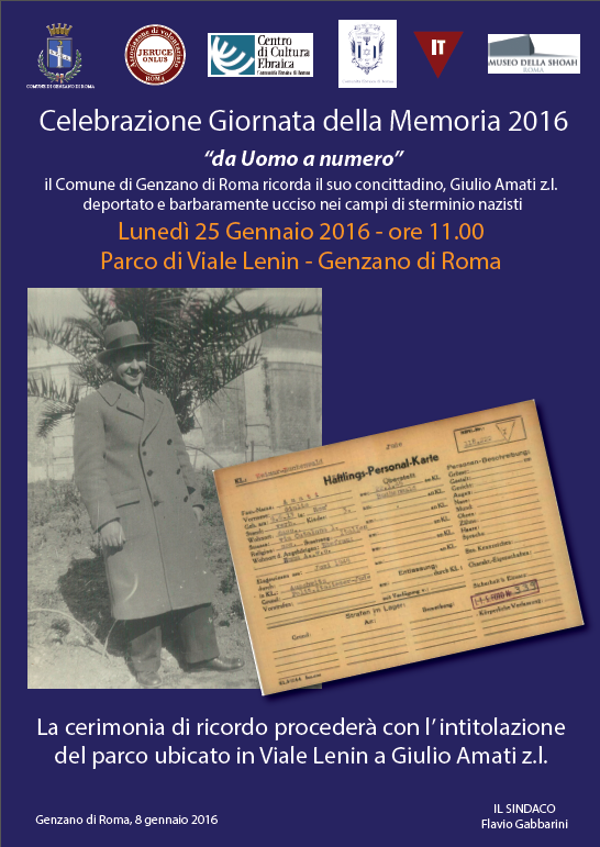 In occasione delle iniziative realizzate per la Giornata della Memoria‚ celebrata il 27 gennaio di ogni anno in commemorazione delle vittime dell'Olocausto‚ il Comune di Genzano (Roma)‚ insieme a Jeruce onlus‚ al Centro di Cultura Ebraica alla Comunità Ebraica di Roma al Museo della Shoah di Roma invitano a Da Uomo a numero‚ una cerimonia in ricordo di Giulio Amati z.l. cittadino di Genzano deportato e ucciso barbaramente in un campo di sterminio nazista. Appuntamento alle ore 11.00 di lunedì 25 gennaio 2016 nel Parco di Viale Lenin di Genzano di Roma. Per informazioni www.volontariato.lazio.it/jeruce