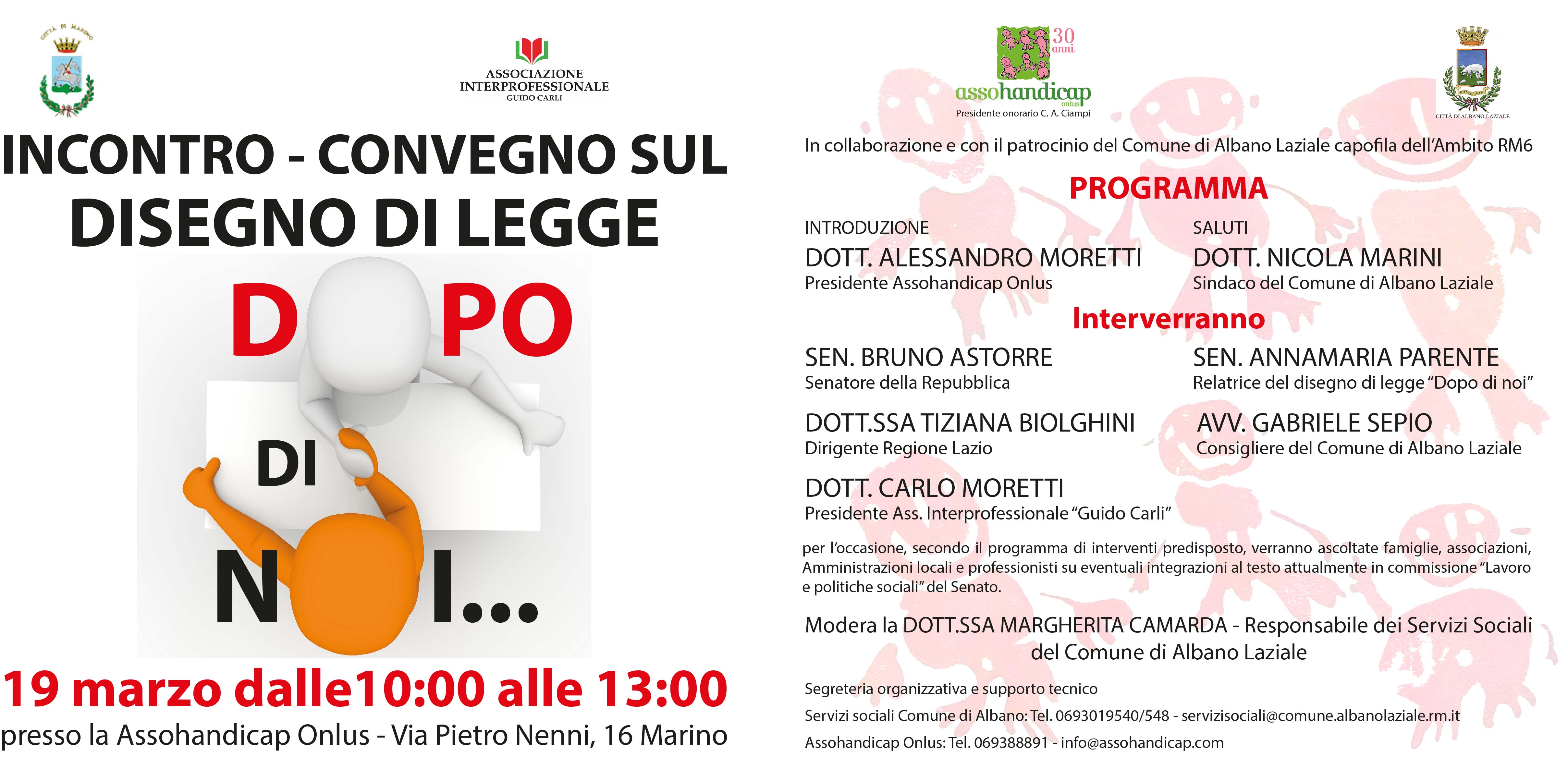 Il Comune di Albano Laziale‚ in collaborazione con Assohandicap‚ organizza per sabato 19 marzo dalle ore 10.00 alle ore 13.00‚ presso i locali della Associazione Assohandicap in Via Pietro Nenni 16‚ Marino (RM)‚ un incontro-convegno relativo al disegno di legge sul Dopo di Noi. Interverranno il Senator Bruno Astorre e la relatrice della legge Senatrice Annamaria Parente che per l’occasione‚ secondo il programma di interventi predisposto‚ ascolteranno famiglie‚ associazioni‚ amministrazioni locali e professionisti su eventuali integrazioni al testo attualmente in commissione “Lavoro e politiche sociali” del Senato. Per ulteriori informazioni rivolgersi alla Segreteria Organizzativa del Comune di Albano Laziale‚ ai Responsabili di Procedimento‚ Assistenti Sociali Dott. Mauro Gasperini e Dott.ssa Valentina Alberti ai numeri 06.93019548-540.