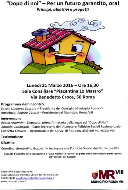Appuntamento lunedì 21 marzo 2016 dalle ore 16.30 presso la Sala Consiliare del Municipio VIII in Via Benedetto Croce‚ 50  per l’incontro Dopo di noi - Per un futuro garantito‚ ora!