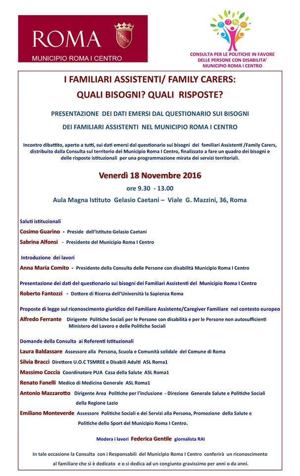 Venerdì 18 novembre 2016 dalle ore 9.30 alle ore 13.00 si svolgerà il dibattito‚ promosso dalla Consulta per le Politiche in favore delle Persone con Disabilità Municipio Roma I Centro‚ “I familiari assistenti/family carers: Quali bisogni? Quali risposte?”. Durante l’incontro saranno presentati i dati emersi dal questionario sui bisogni dei familiari Assistenti/Family Carers‚ distribuito dalla Consulta sul territorio del Municipio Roma I Centro‚ finalizzato a fare un quadro dei bisogni e delle risposte istituzionali per una programmazione mirata dei servizi territoriali. L’appuntamento è presso l’Aula Magna dell’Istituto Gelasio Caetani‚ viale G. Mazzini‚ 36 a Roma.