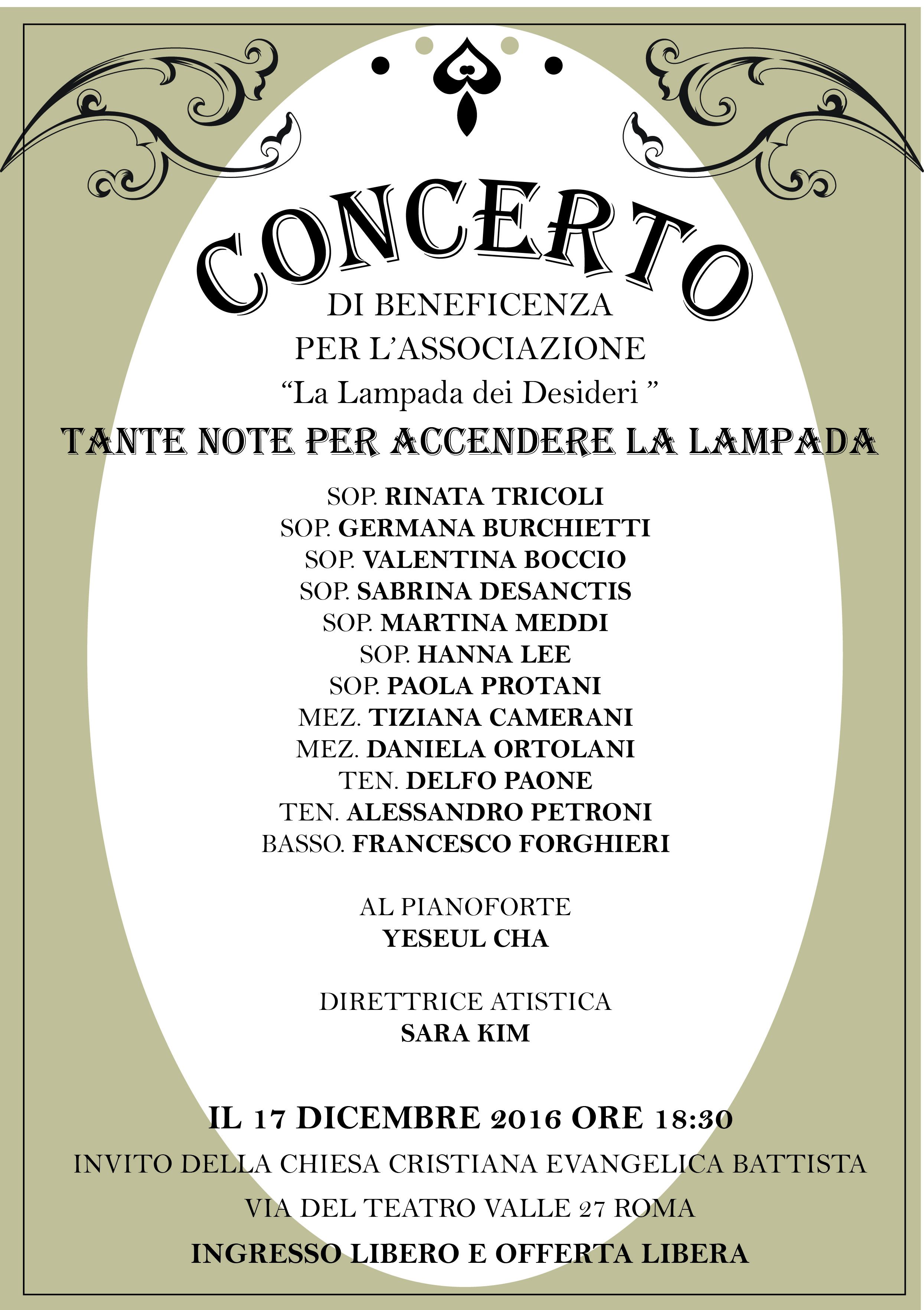 L’associazione La Lampada dei desideri invita al concerto di beneficenza “Tante note per accendere la lampada”‚ il sabato 17 dicembre alle ore 18.30 presso la Chiesa Battista di Via del Teatro Valle‚ 27 a Roma. L’offerta è libera‚ il ricavato sarà destinato alle attività dell’associazione.